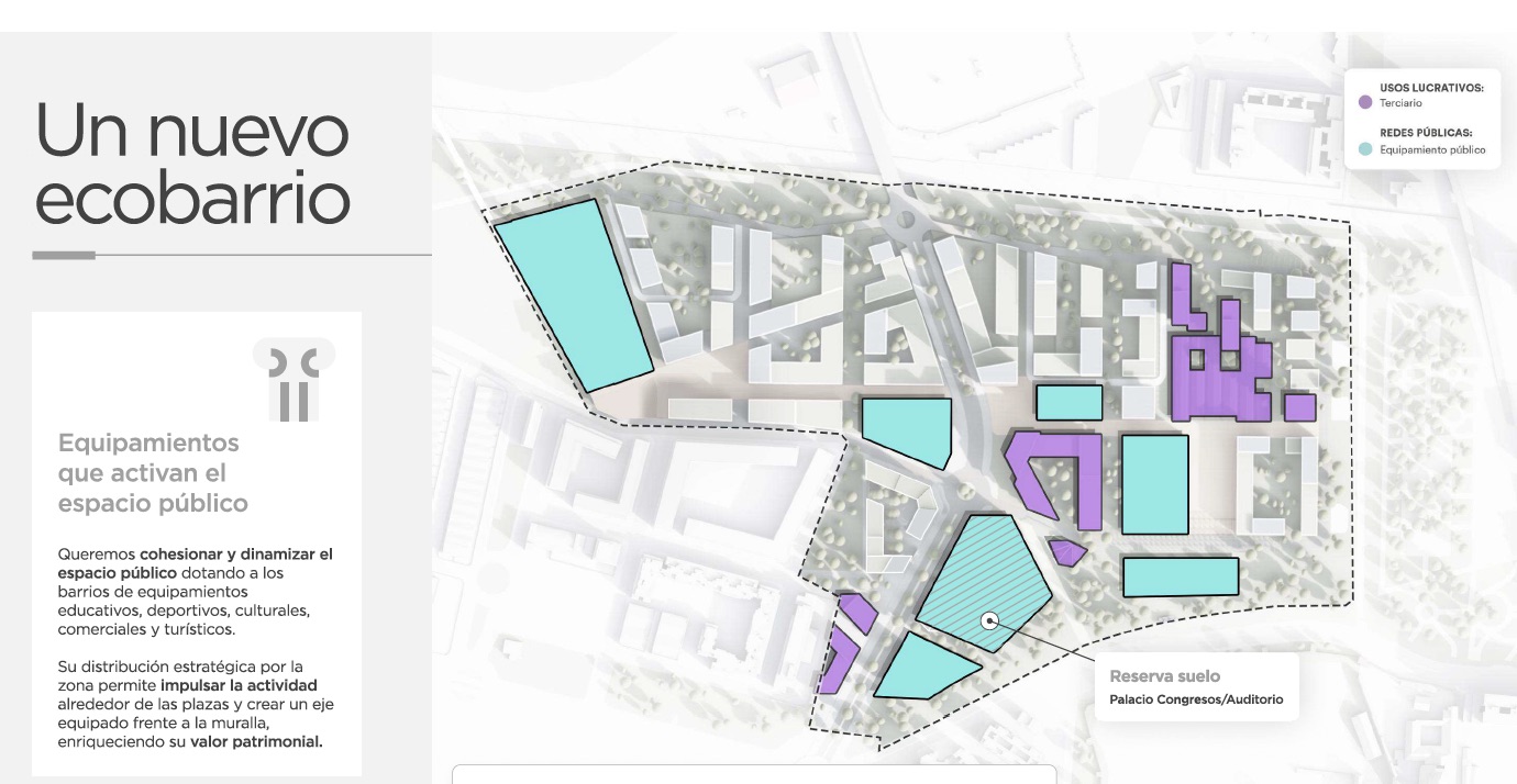 15 parcelas residenciales, 7 de equipamientos y 4 terciarias. Repartidas en 80.000m2 de terrenos terciarios, equipamientos y comerciales, 80.000m2 de zonas verdes y 30.000m2 de zonas estanciales y plazas.