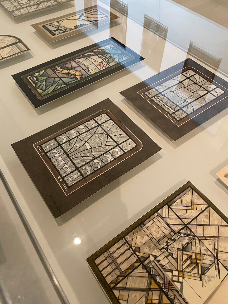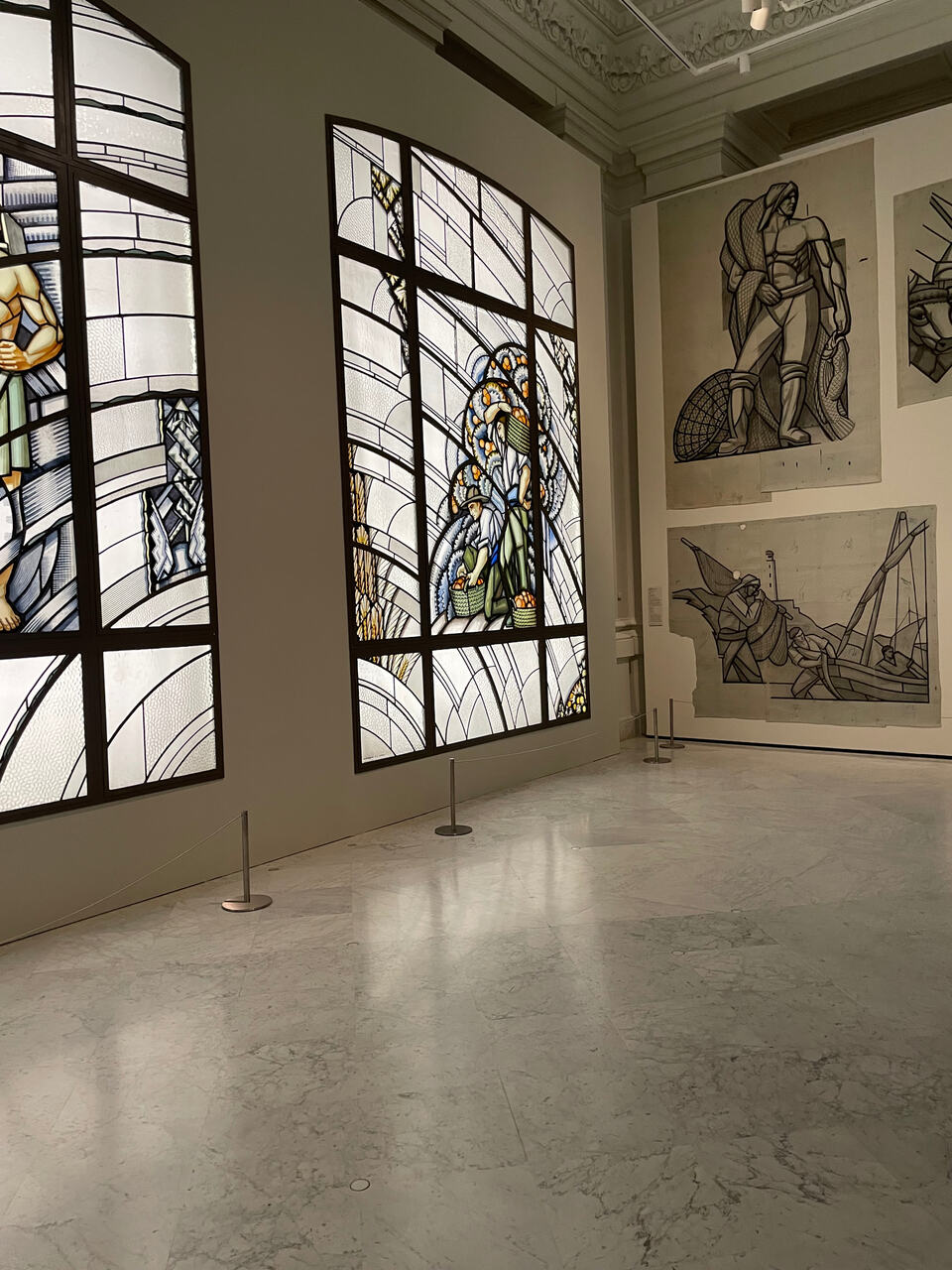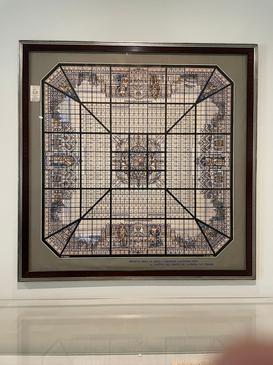 La exposición reúne un conjunto de casi 150 obras, entre las que destacan los dibujos, bocetos y cartones originales de las vidrieras que la Casa Maumejean diseñó para la ampliación. Gracias a una labor conjunta entre el Banco de España, el Museo Nacional de Artes Decorativas y la Fundación Centro Nacional del Vidrio, estos materiales, en su mayor parte inéditos, han sido restaurados y se muestran por primera vez al público.