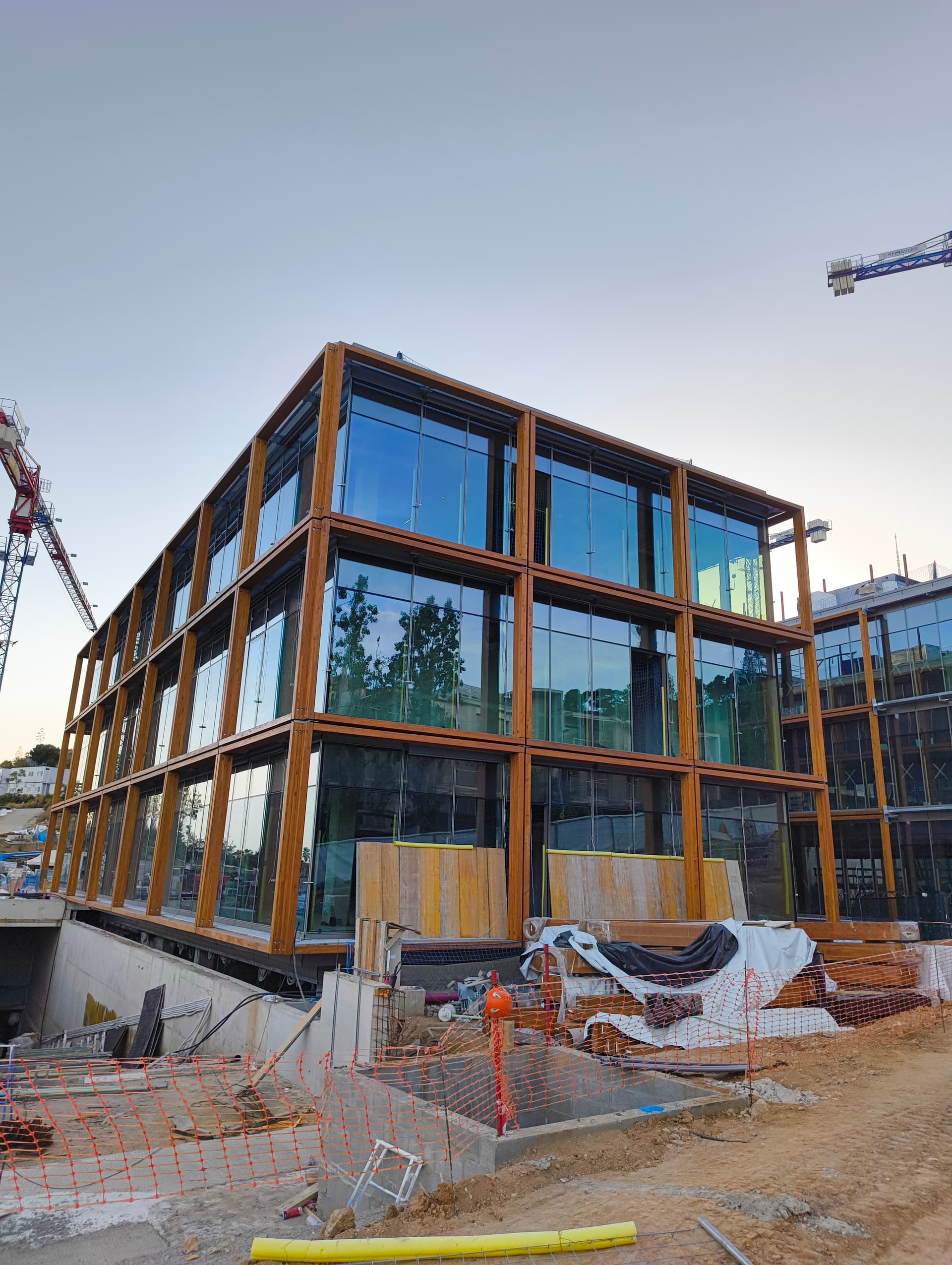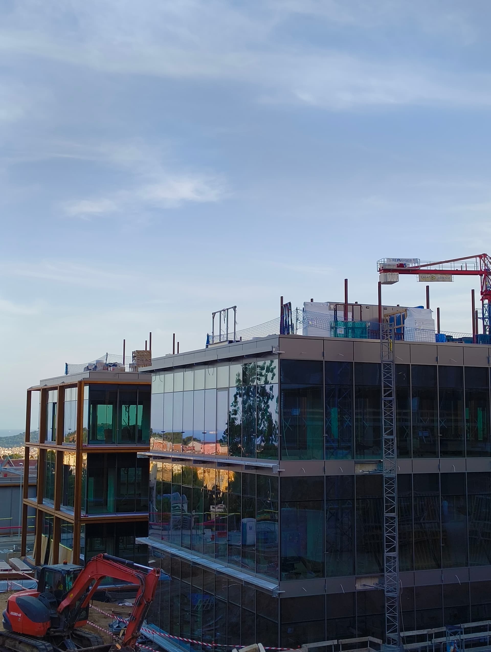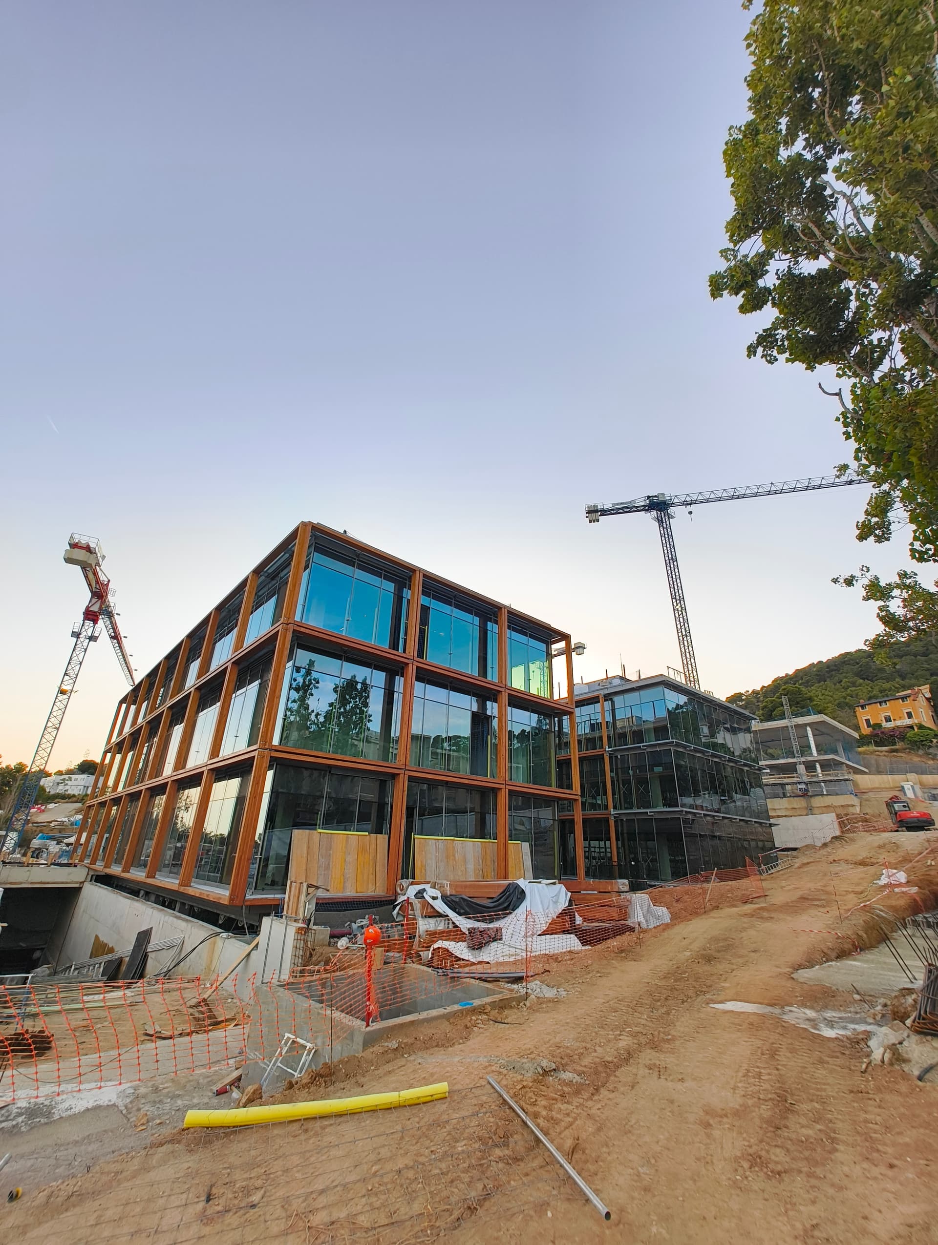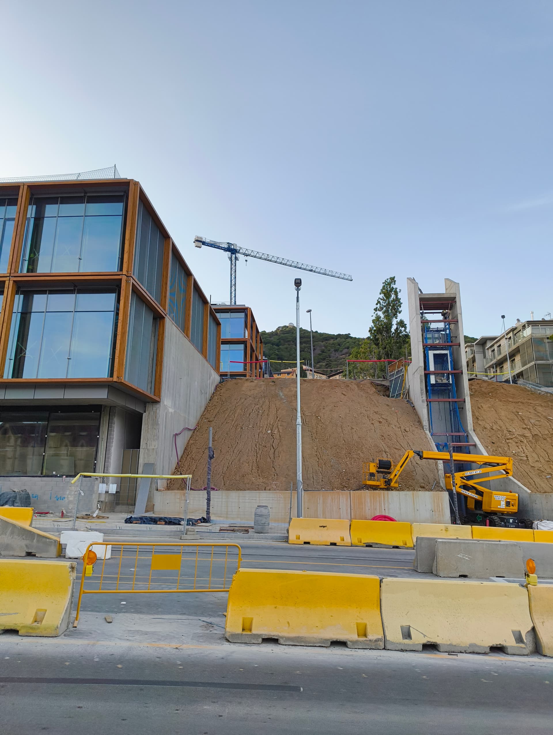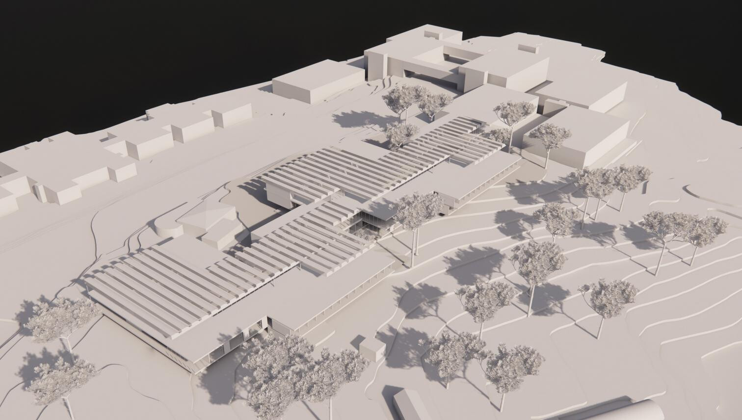 El edificio se alinea estratégicamente con la pineda existente, respetando la vegetación mientras aprovecha la topografía del terreno para lograr una implantación eficiente. Esta disposición permite generar una terraza superior con vistas a las sierras de Collserola y de Montserrat, garantizando a su vez una óptima iluminación y ventilación natural en el interior.