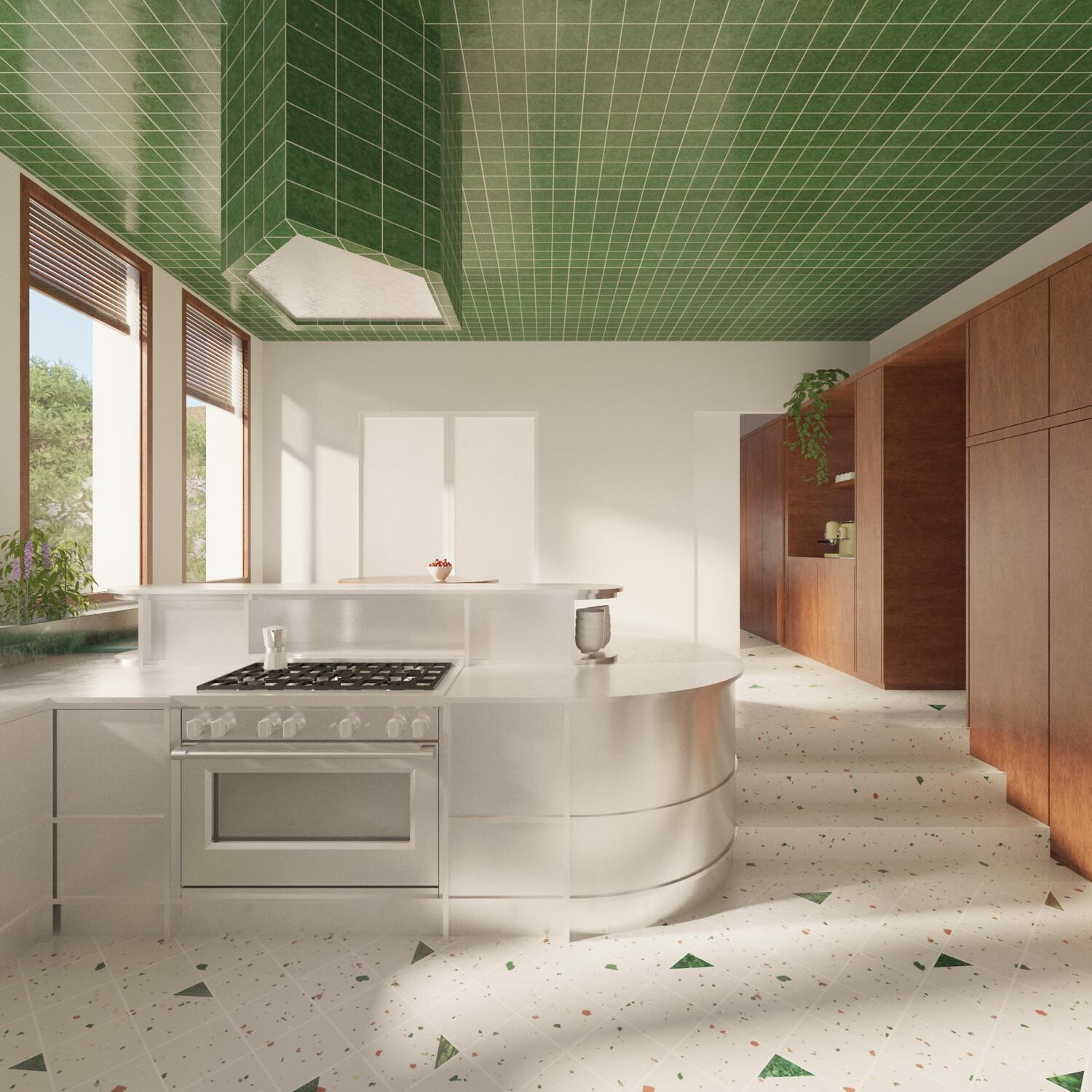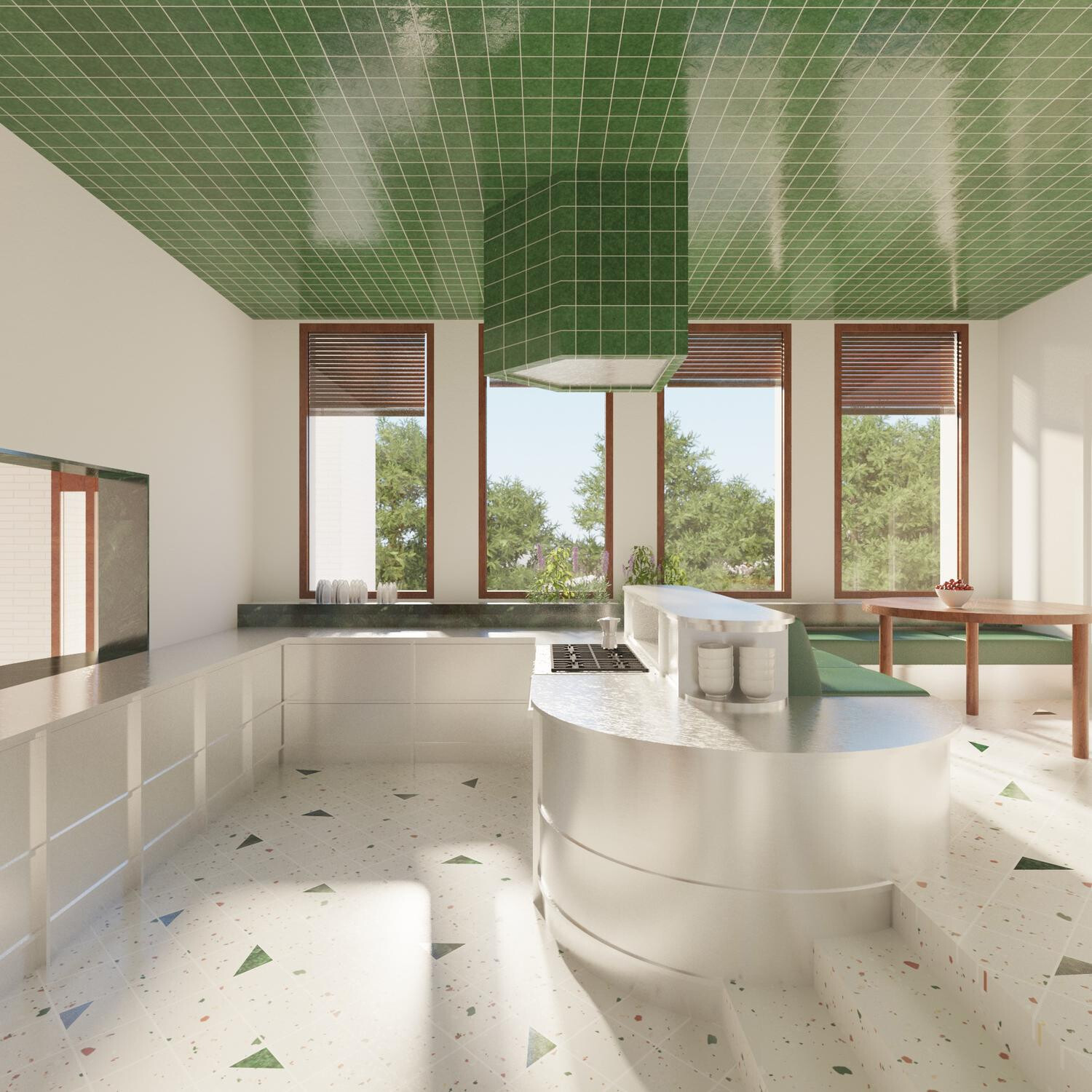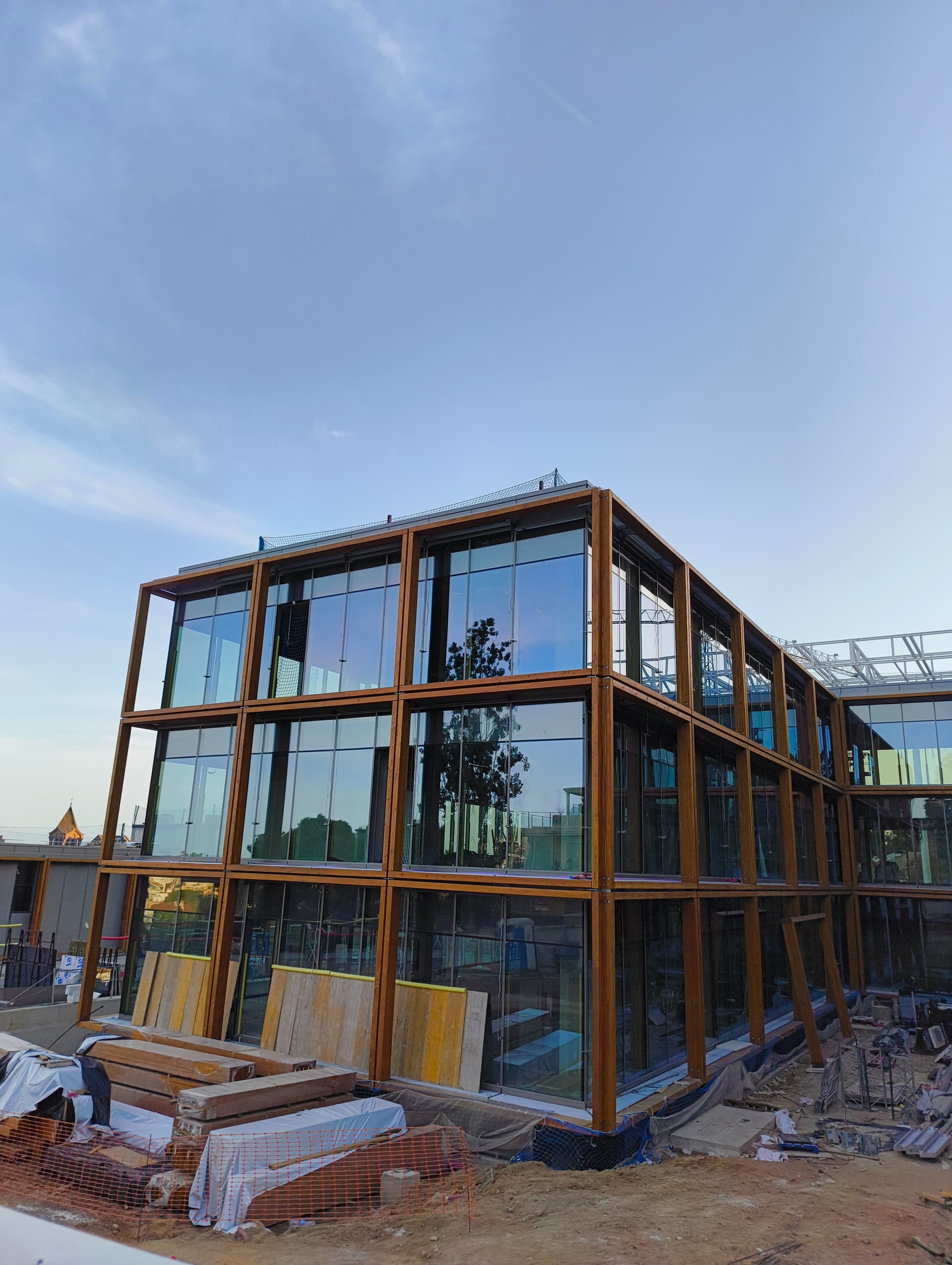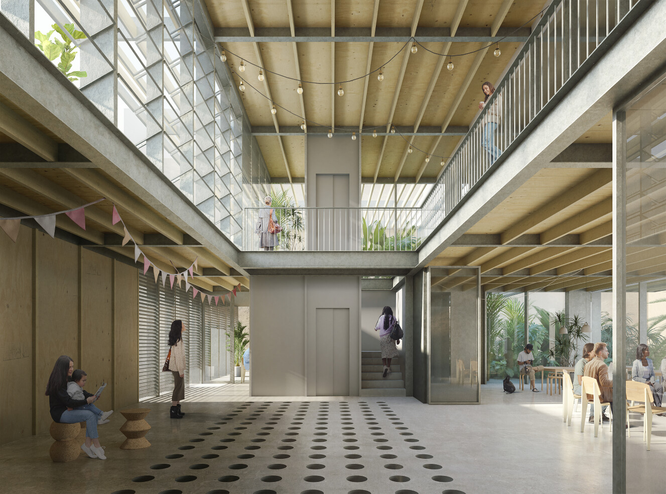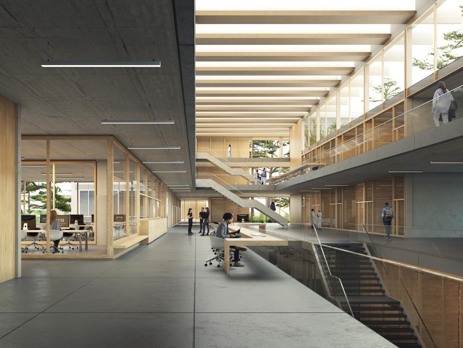 El edificio se alinea estratégicamente con la pineda existente, respetando la vegetación mientras aprovecha la topografía del terreno para lograr una implantación eficiente. Esta disposición permite generar una terraza superior con vistas a las sierras de Collserola y de Montserrat, garantizando a su vez una óptima iluminación y ventilación natural en el interior.