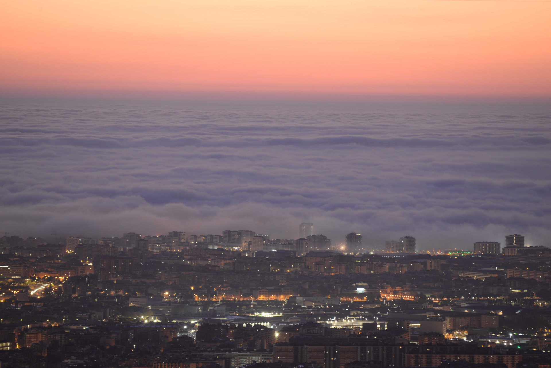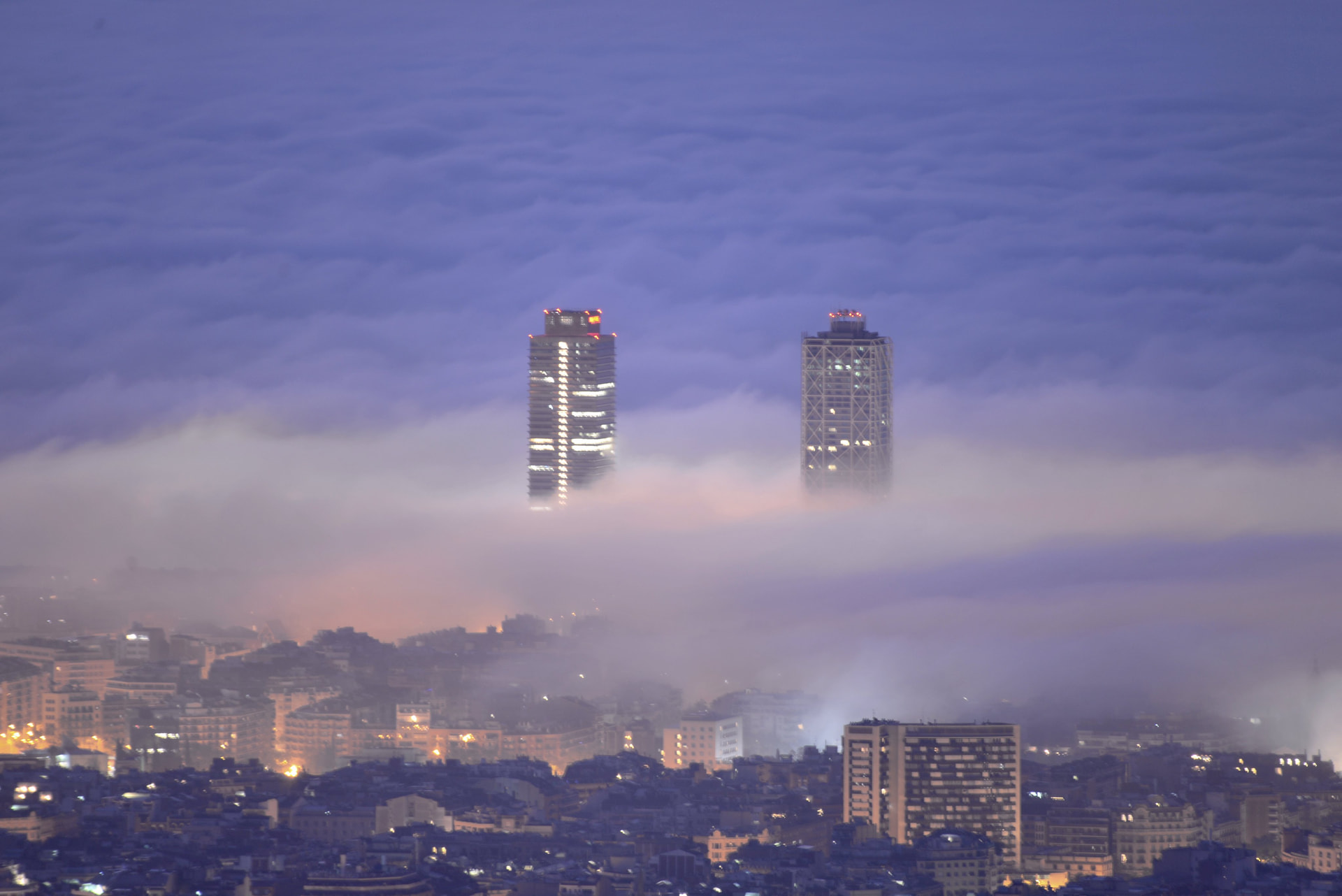 Banc de boira sobre el mar penetra aquest matí alguns metres terra endins i oculta els primers pisos d’edificis emblemàtics: Torre Colón, Torres de Vila Olímpica, Hotel Vela, telefèric…