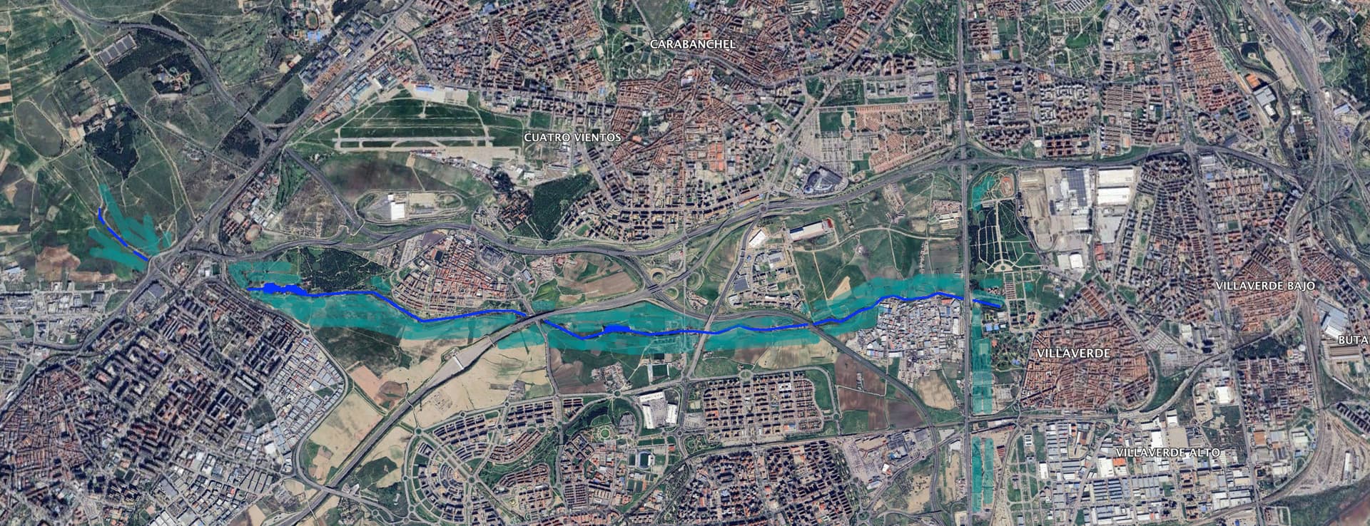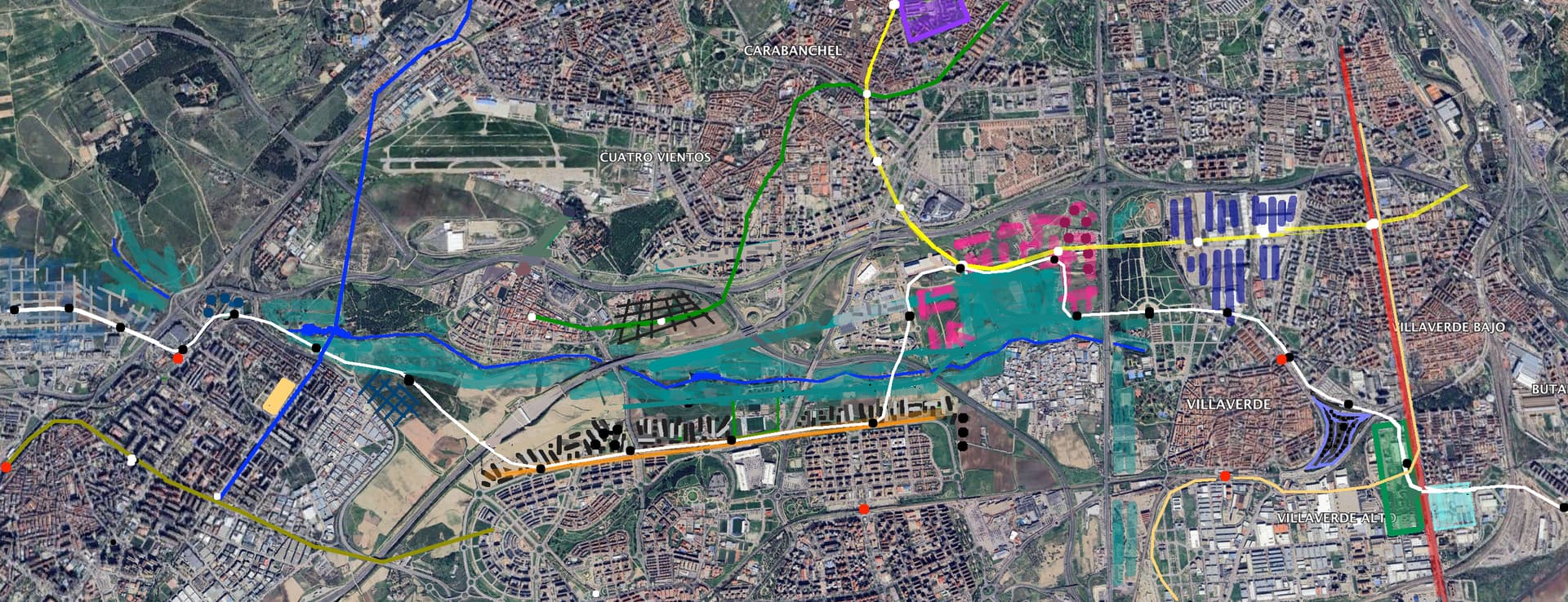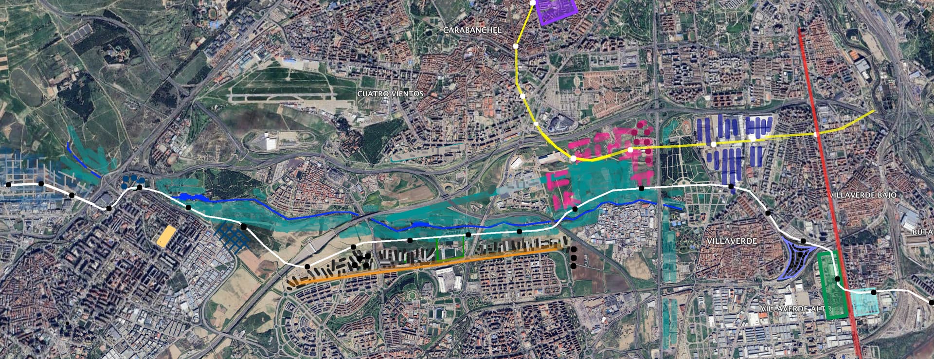 En su extremo oeste con el centro de Alcorcón y nuevos barrios de su expansión Oeste y en su extremo Este con un nuevo barrio de torres de oficinas en Villaverde (lila y negro) y la Ciudad Administrativa de la Cam y la del Ejército para prolongarse después hacia el desarrollo de Valdecarros pasado el Manzanares.