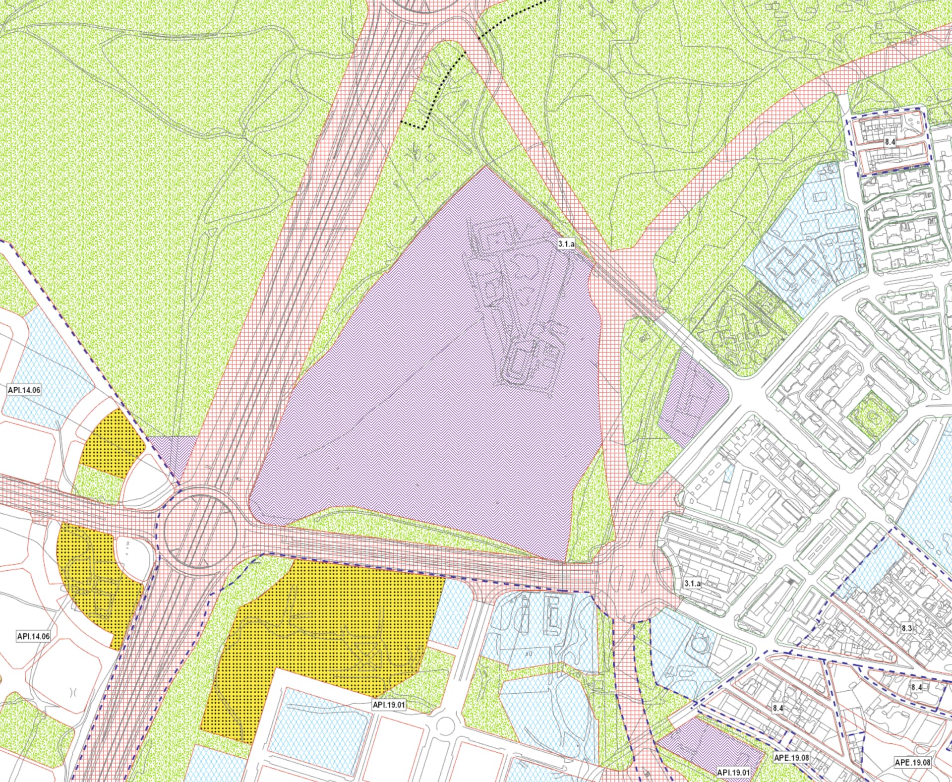 ^^ En esta imagen aparece la UA 14.01 (Fuente Carrantona) a la izquierda, y las zonas marcadas con “A” en Verde oscuro a la derecha que pertenecen a la otra UA, pero que son zonas verdes existentes. Lo que no está sombreado no entra en el area de actuación. Concretamente la parcela en la que está IMBISA (Foto satélite de principios de 2020 con los camiones vaciando la parcela y habiendo destruido ya todos los edificios existentes menos uno del que hablaremos luego)