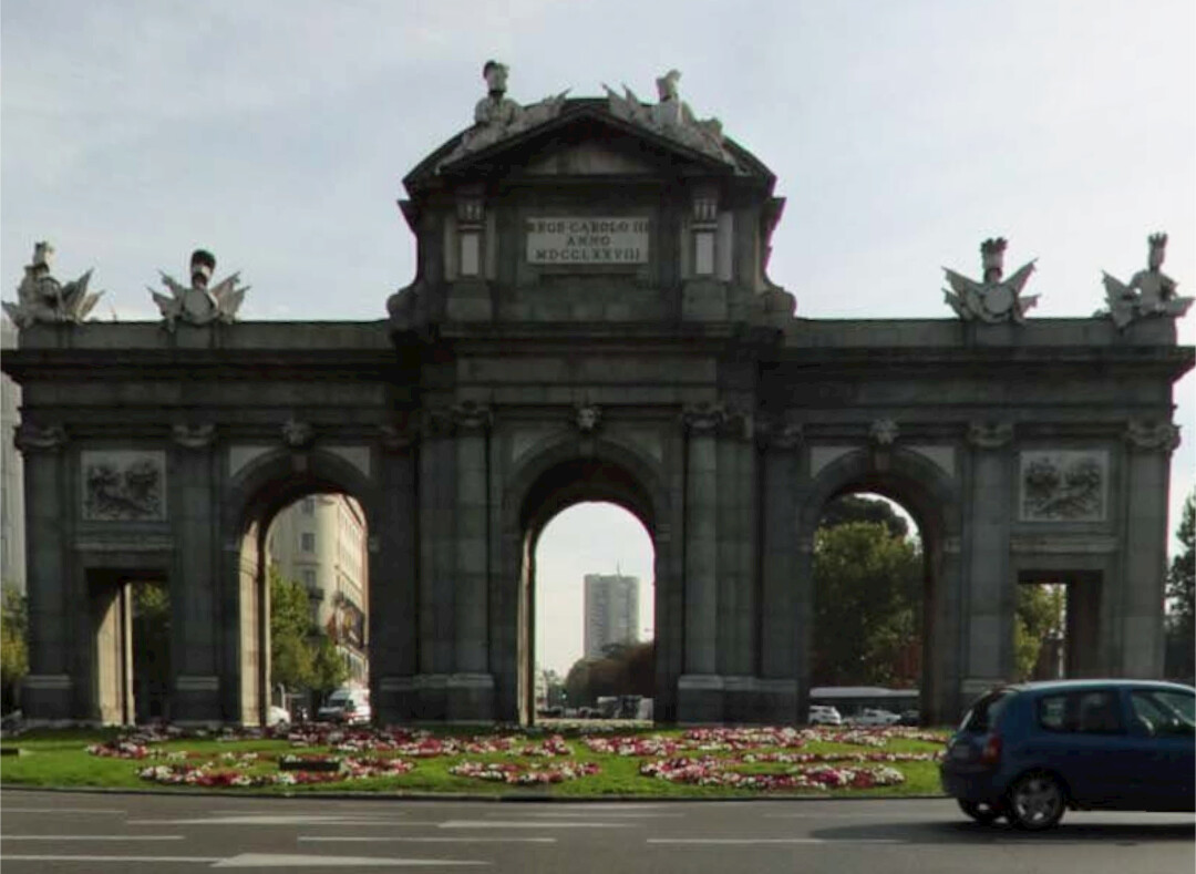 Tercero, se me ocurre que para disimular la Torre de Valencia, se puede poner una puerta-verja historicista en la abertura central de la Puerta de Alcalá, de hecho hay varias fotografías antiguas que aparecen las tres puertas. Creo que puede ser un elemento curioso y volver más original todavía (p.e. la reconstruida Puerta de Hierro).