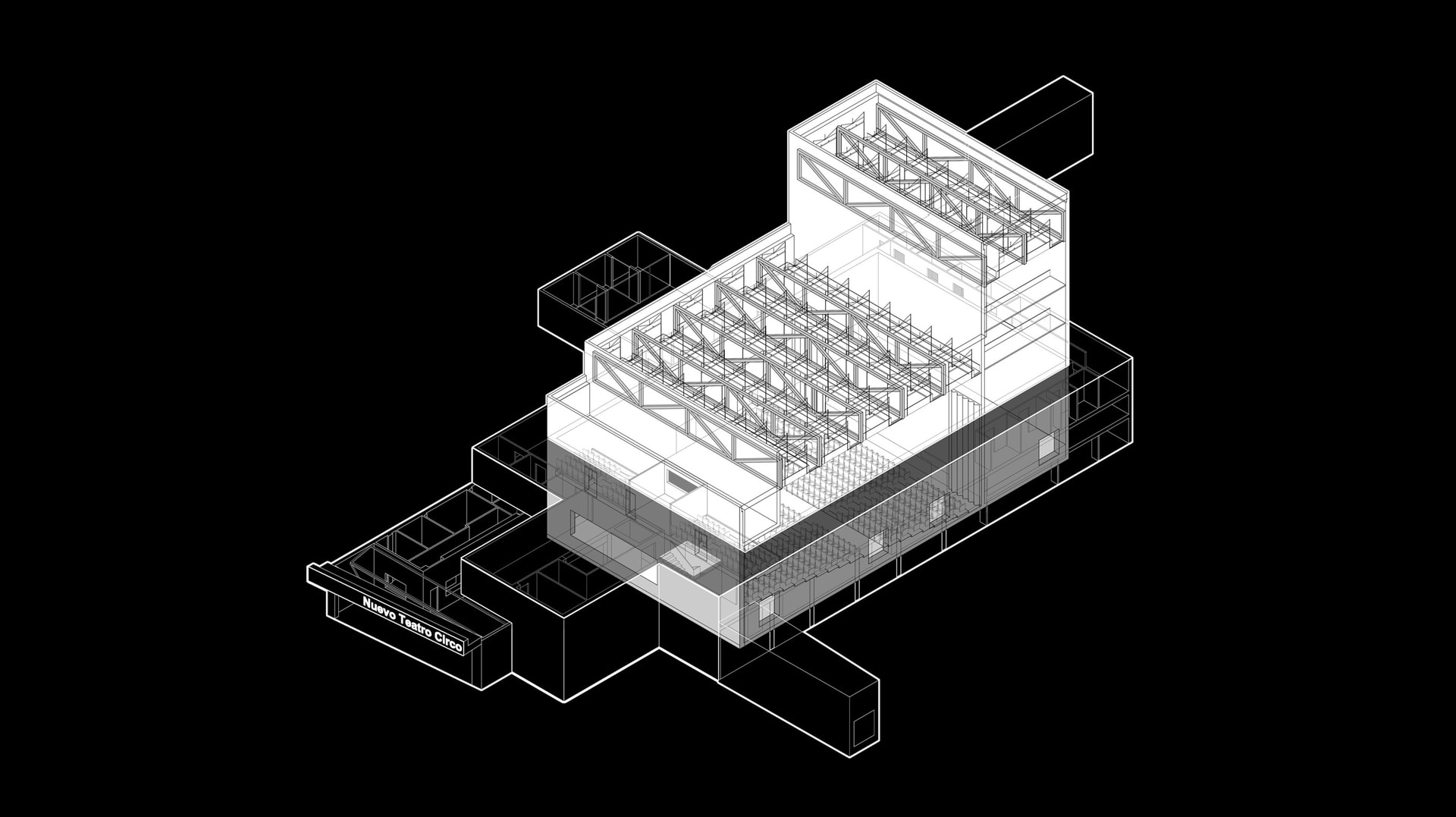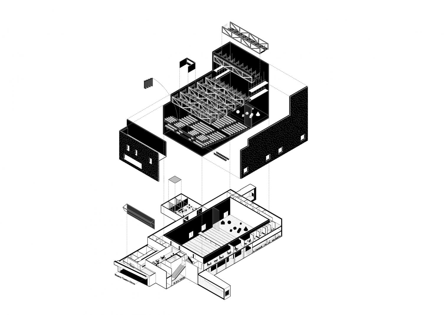 El proyecto se estructura a partir de una intervención clave: la transformación completa de la caja escénica, concebida no solo como un espacio técnico, sino como el núcleo conceptual y operativo del nuevo teatro. La caja existente se sustituye por una estructura de gran escala que amplía sus funciones más allá del escenario convencional y cuestiona el modelo clásico de sala frontal.