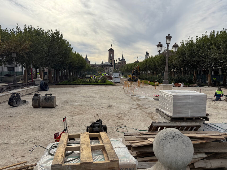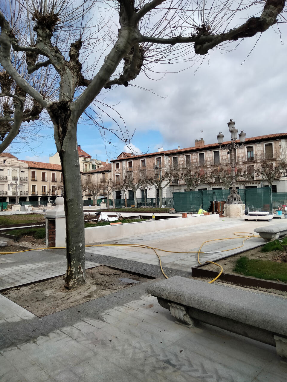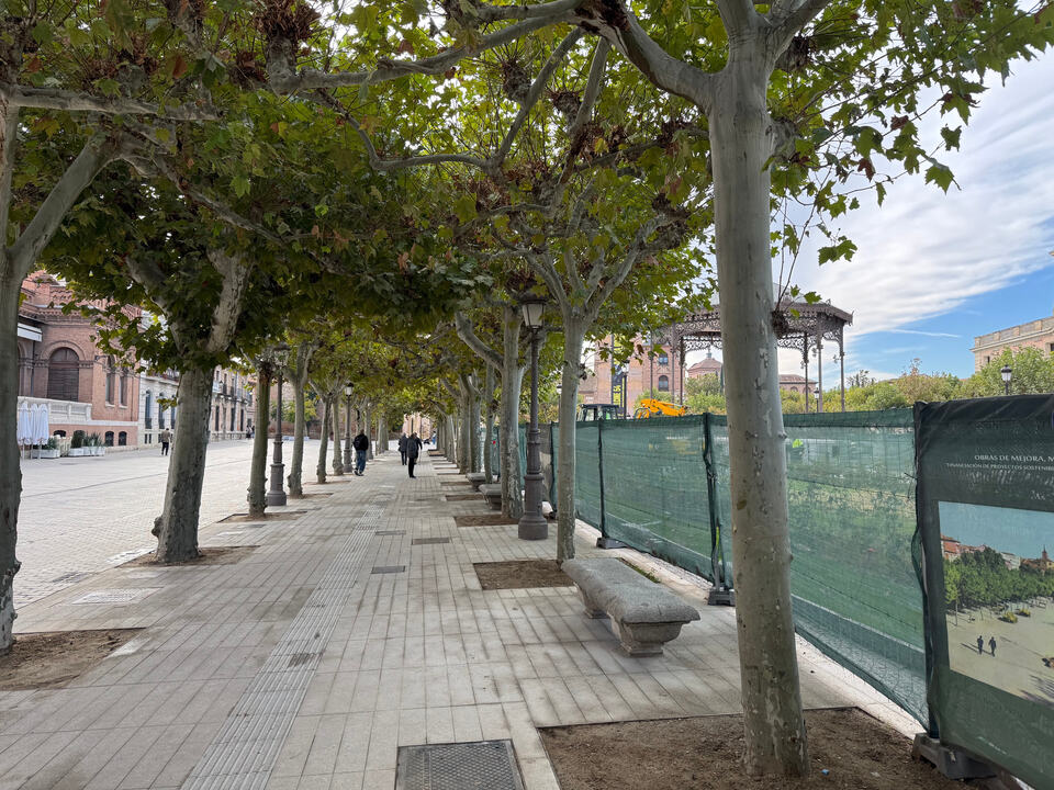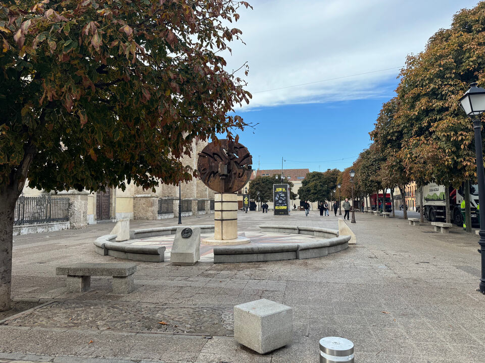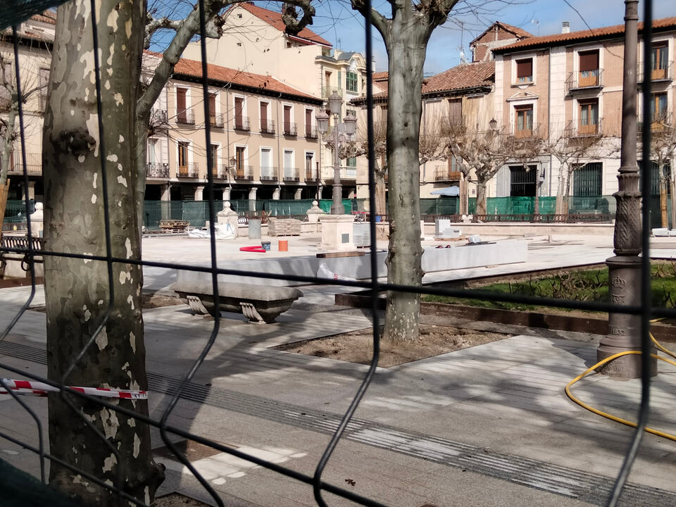 Avanzan las obras de la plaza de Cervantes en su última fase. Parterres a punto y los nuevos bancos corridos que también están terminando harán que se disimulen los armarios eléctricos actuales. También se va viendo el nuevo letrero/photocall de Alcala de Henares.