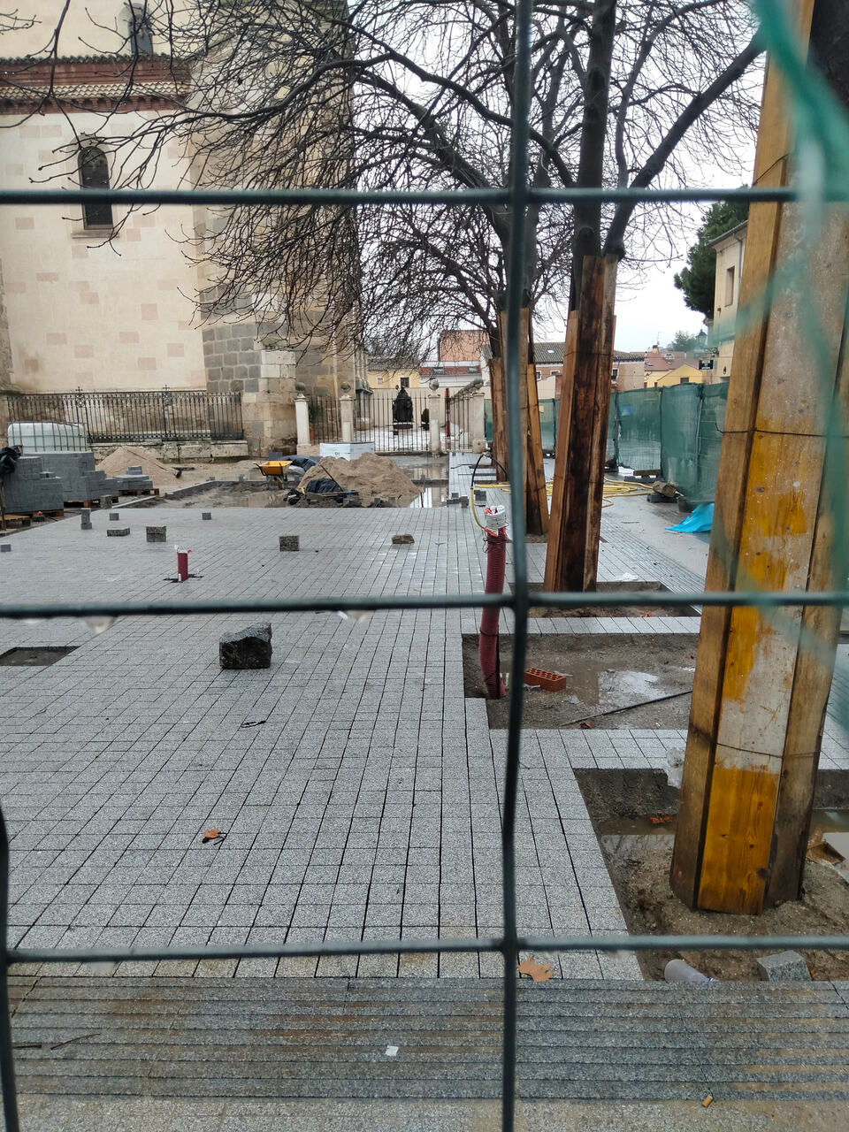 Avanzan las obras de la plaza de los Santos Niños. Ya se ve el avance del pavimento, del mismo modelo que se puso en las obras de peatonalización. No está en imagen, pero ya se está empezando a desmontar el monumento al descubrimiento, que hay que recordar que se trasladará a la Garena, en el parque Santa Rosa de Lima, entre DGT y IES Francisca de Pedraza.