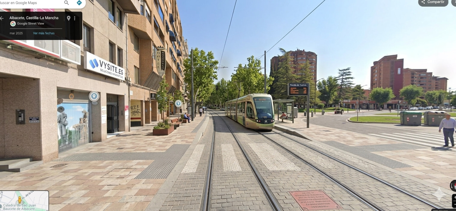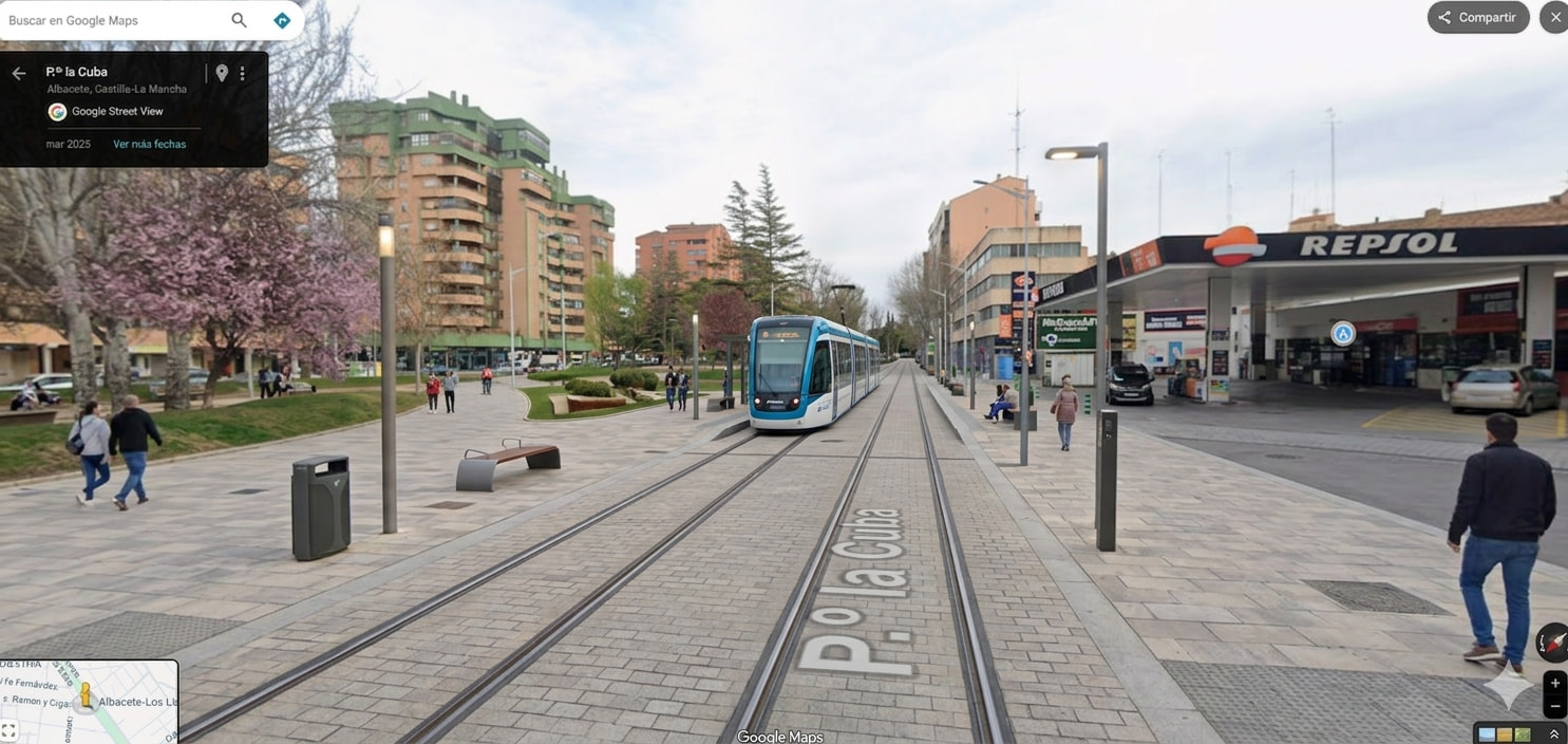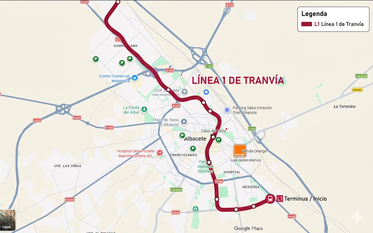 Es una propuesta personal generada con inteligencia artificial a día de hoy no existe tal tranvía en la ciudad de Albacete pero sería una muy buena idea ya que es un transporte muy sostenible y eficiente y en una ciudad como en Albacete que es todo llano sería muy fácil su instalación.