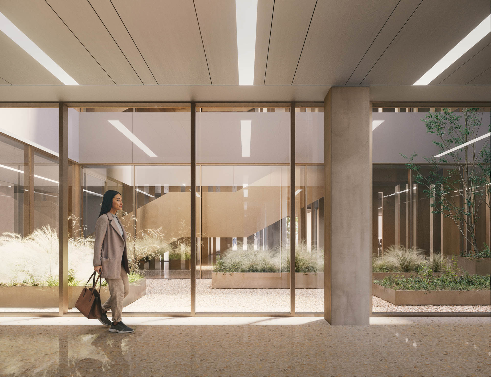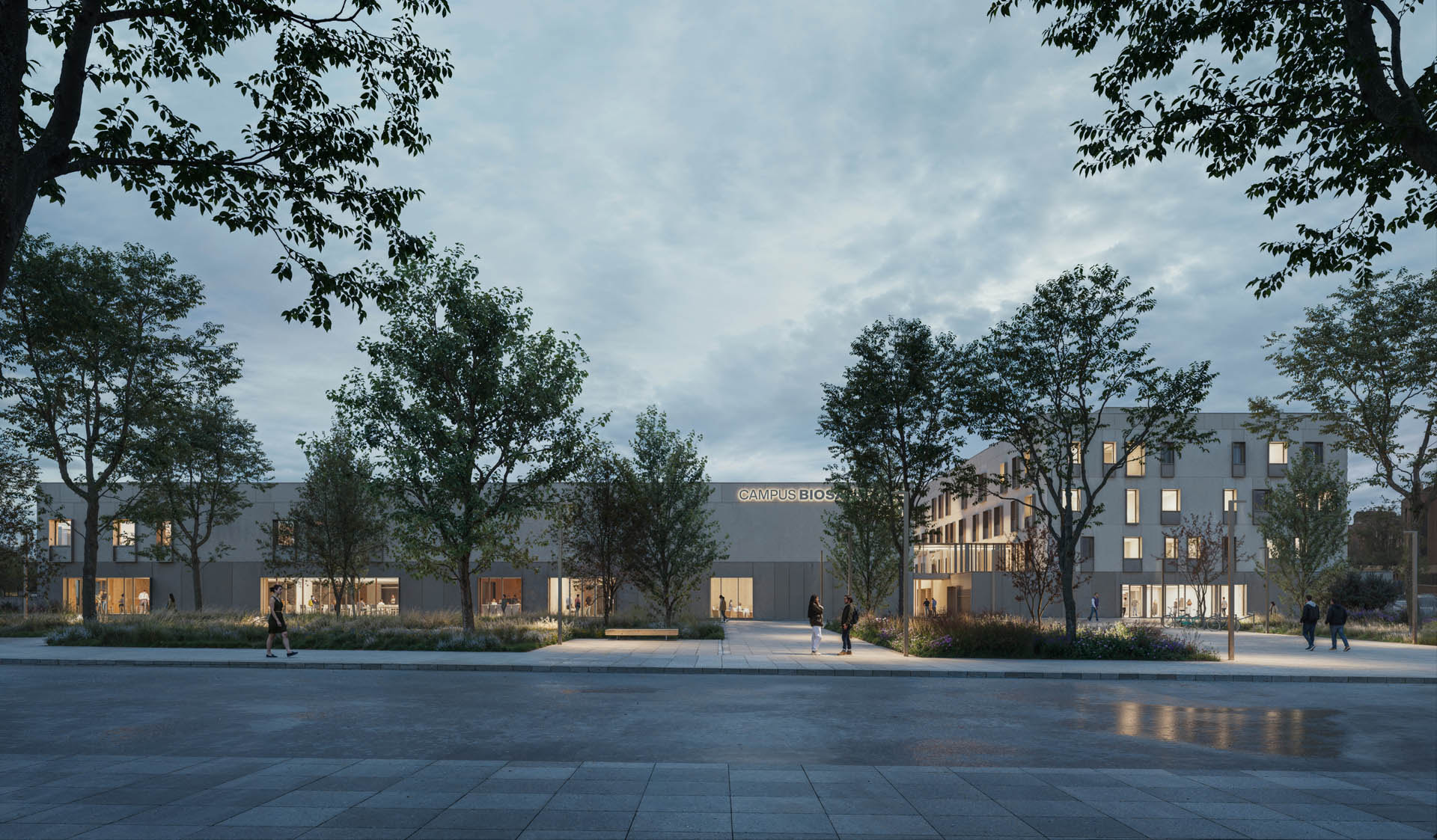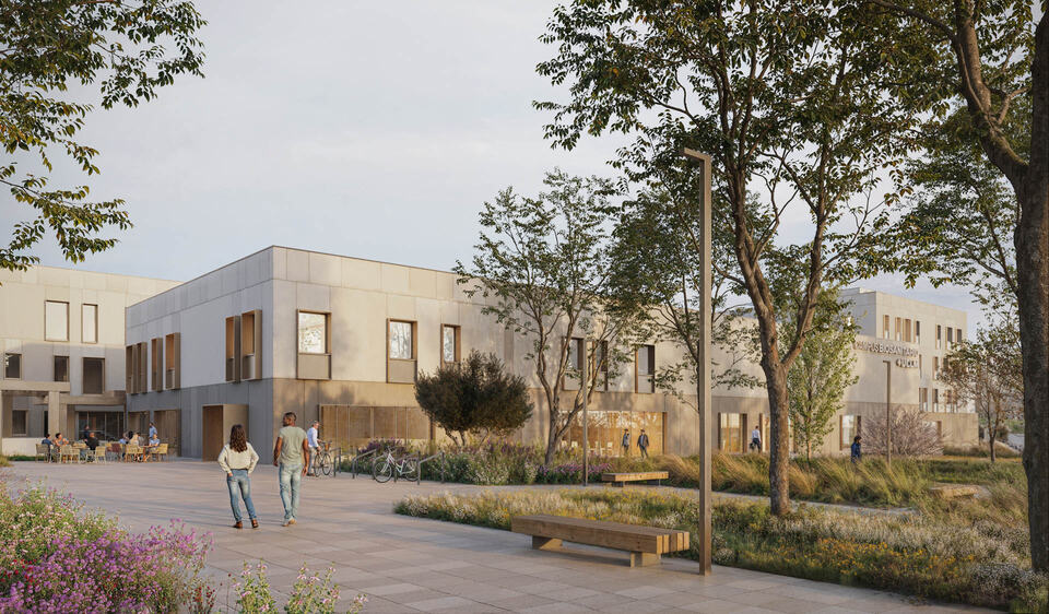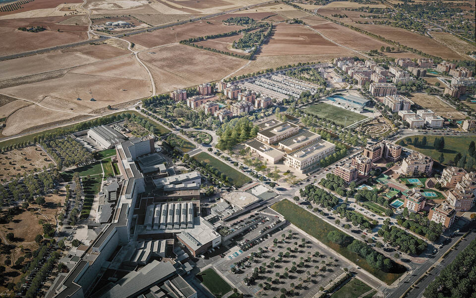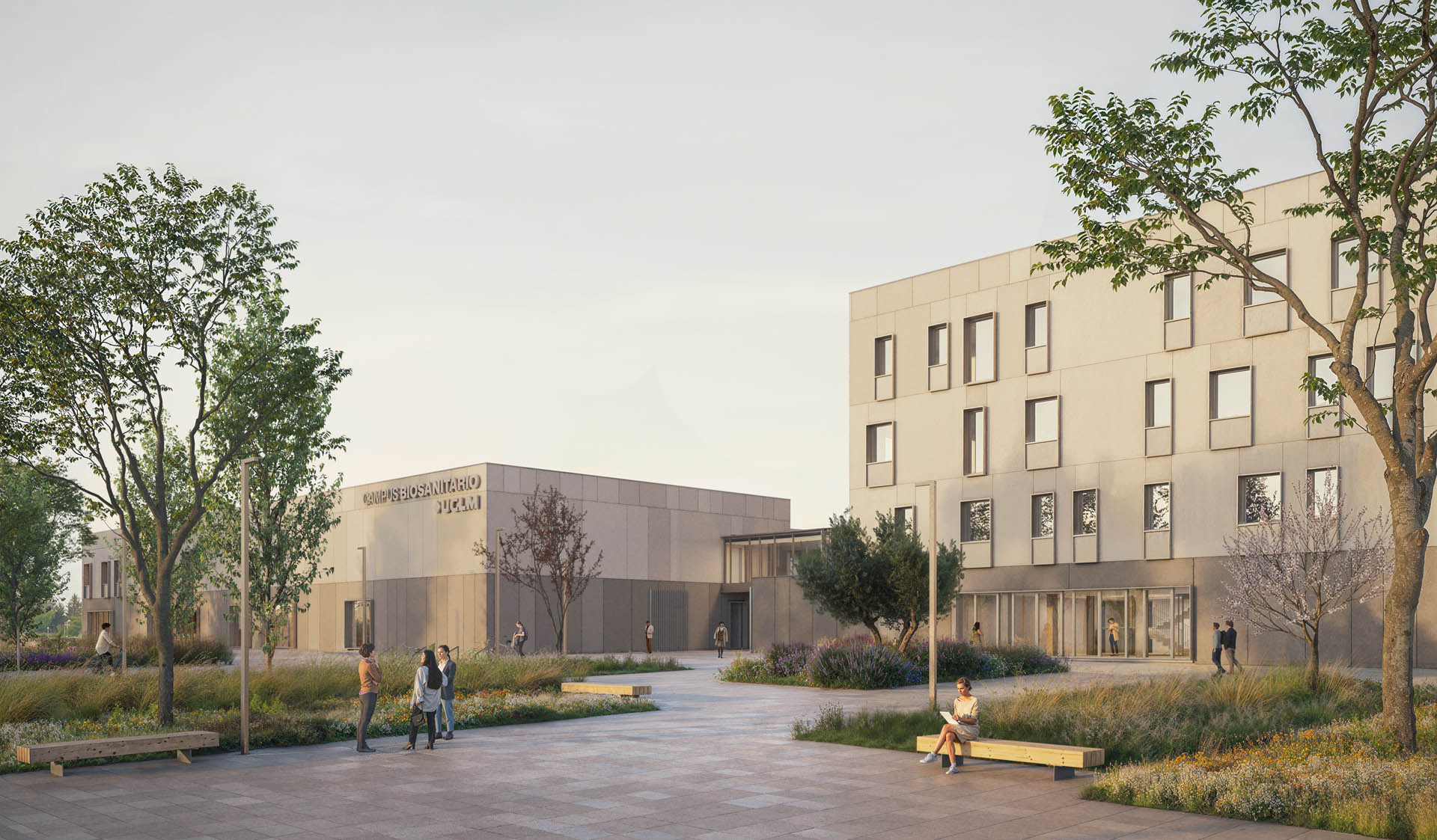 La utilización de la cerámica en tonos ocre como material generalizado en las fachadas transforma la percepción del edificio y lo acerca a la sensibilidad local y regional. Esta vocación de cercanía y apertura también se traslada a la transformación de la planta baja como un espacio abierto a la ciudadanía y transparente en su acceso. En la media distancia se muestra compacto y continuo en su construcción evitando una percepción de gran escala, desvaneciendo la diferencia entre las plantas y haciendo más compleja una lectura directa del número de plantas y por lo tanto de la escala del edificio.