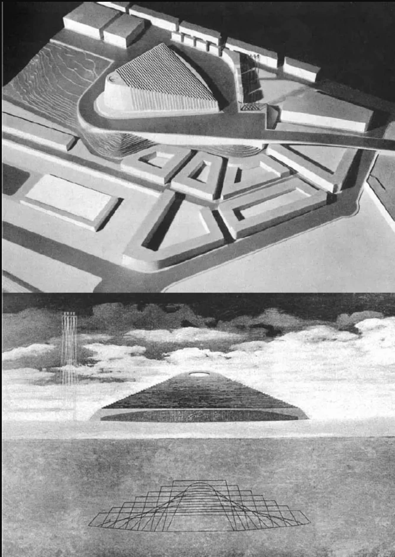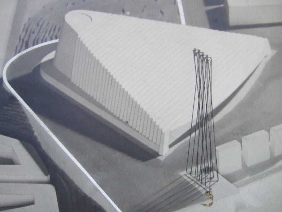 Es la maqueta de un edificio que está en la línea de las iglesias que se construyeron en Madrid en los años 50, 60 y principios de los 70. Una colección de iglesias de lenguaje contemporáneo con algunas joyas deslumbrantes, al menos para el que sepa verlas. La basílica/catedral de Cabrero y Aburto era muy buena arquitectura, en cualquier caso, mucho mejor que lo que perpetró Chueca Goitia, cuya única virtud es que a cierta distancia “hace juego” con el palacio.