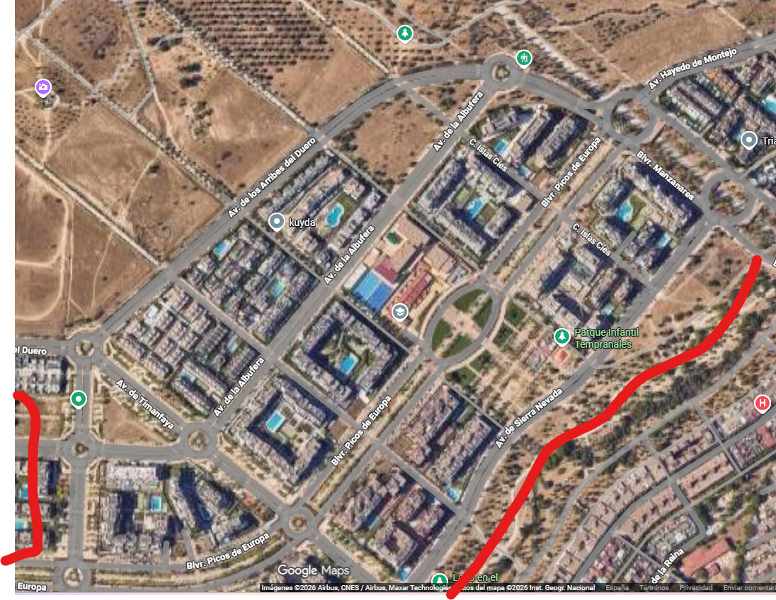 En rojo parques y zona comercial con tres supermercados, sin plazas grandes, ni zonas peatonales, ni zonas de esparcimiento, por no decir que no hay un solo local en todo el barrio.Hay Un colegio y parques aprovechando el arroyo (en rojo al sur). Conclusion : necesitas coche para todo.