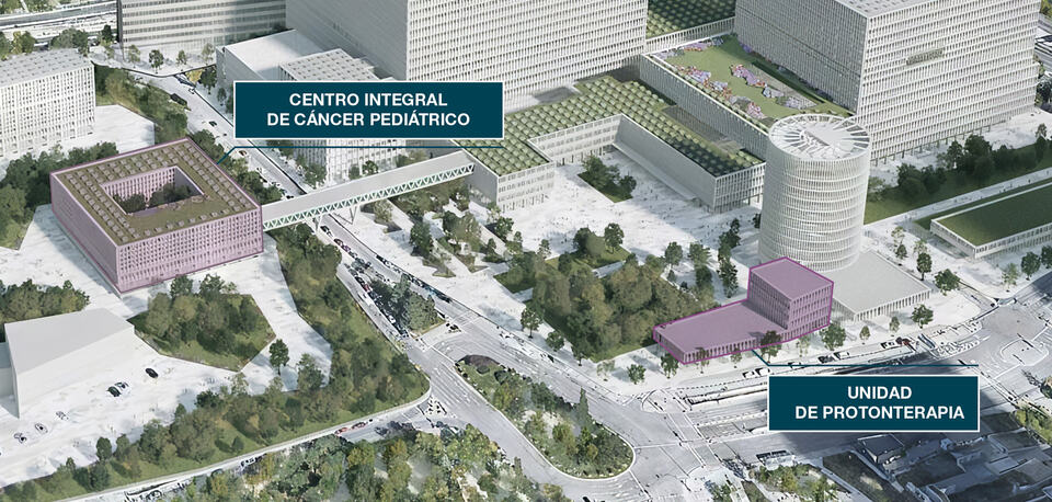 La redacción del proyecto básico y de ejecución del edificio para la unidad de prontoterapia se adjudico a IDOM Consulting Engineering Architecture, su diseño es independiente del proyecto Campo de Retamas y no forma parte de la fase 0.