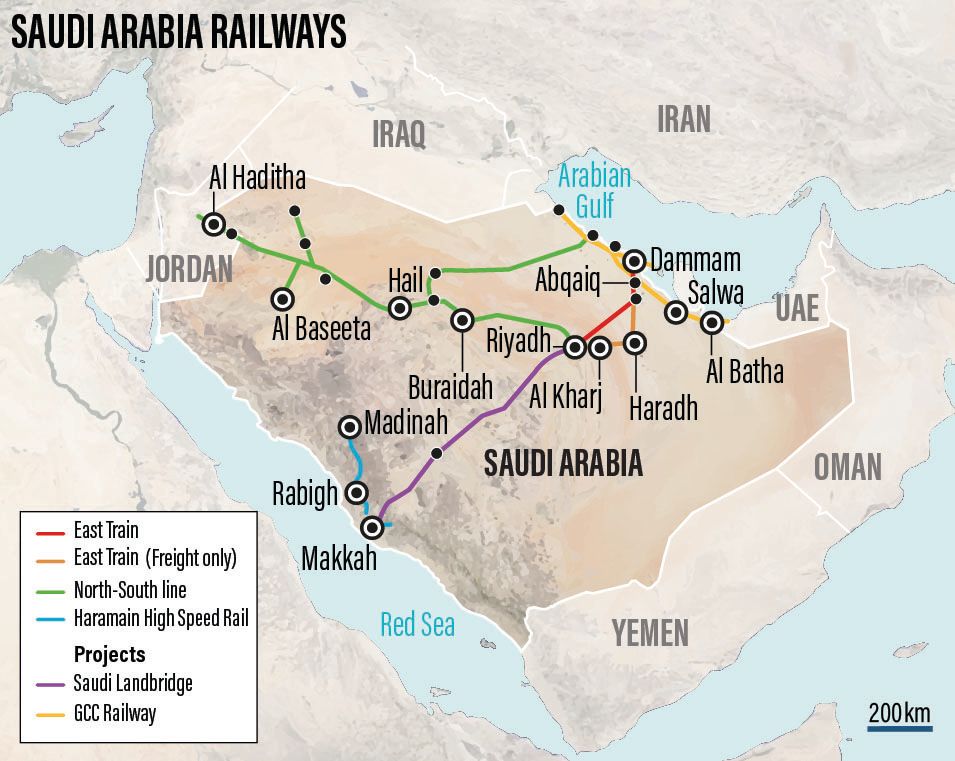 Existe un proyecto para unir las dos costas de Arabia por ferrocarril, pero lleva 20 años en fase de desarrollo sin que haya ningún horizonte claro. La parte más difícil, de Riad al Mar Rojo, no está ni proyectada aún.
