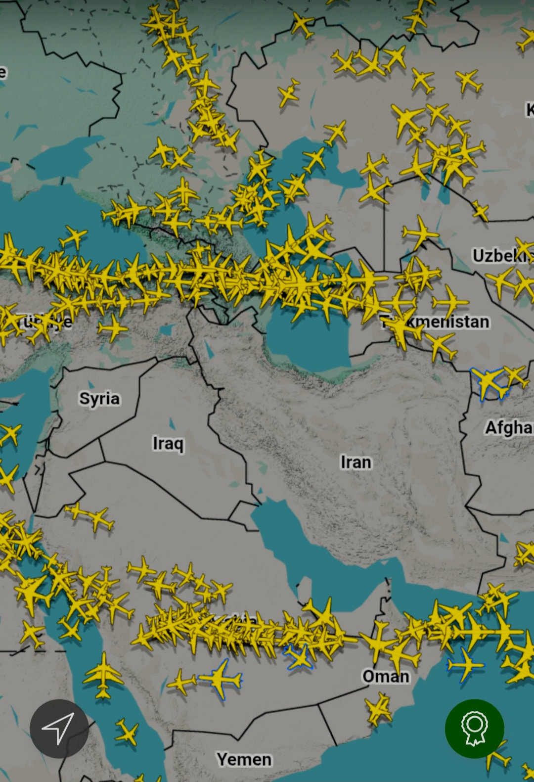 Toda la zona del Golfo es un agujero en Flightradar ahora mismo. Solo funcionan rutas por el Cáucaso o por Arabia Saudí, que sorprendentemente es el único país de la zona que mantiene el tráfico aéreo a pesar de ser el mayor enemigo regional de Irán: