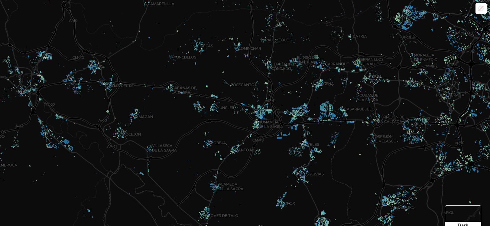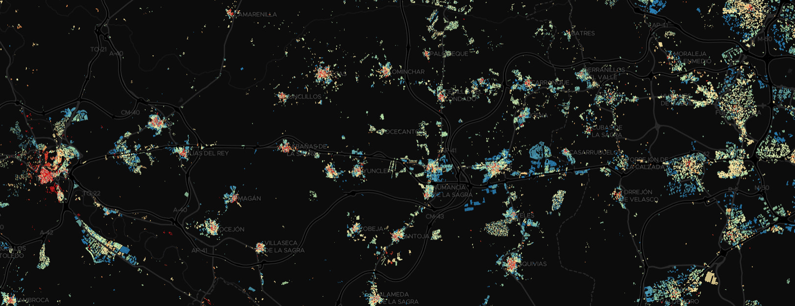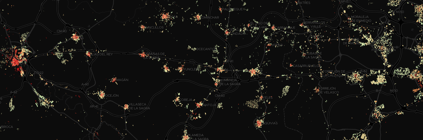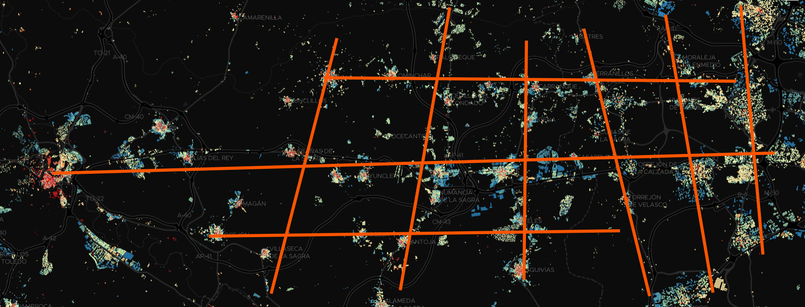 Me parece muy curioso que el espacio entre Toledo y Madrid forme una malla reticular de asentaminetos tan definida.