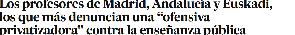 Y siete de cada diez denuncia una “ofensiva privatizadora” de la enseñanza pública, un porcentaje que crece hasta el 90% en el caso de Madrid, Andalucía, Euskadi y Extremadura.”