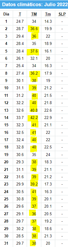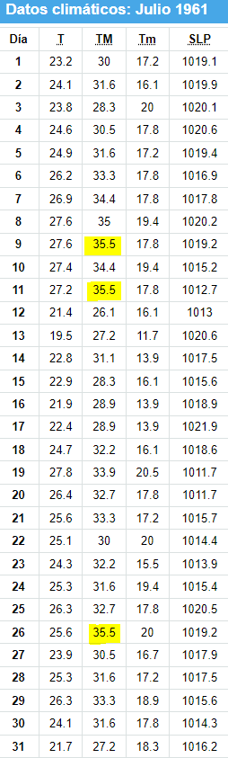 Te pego las T máximas de 1961 en julio en Madrid y en 2022 (en Torrejón) .He marcado los días que superan la máxima de 1961 en 2022. Puedes observar también la subida de las mínimas…noches tropicales. O la subida de la T del día.