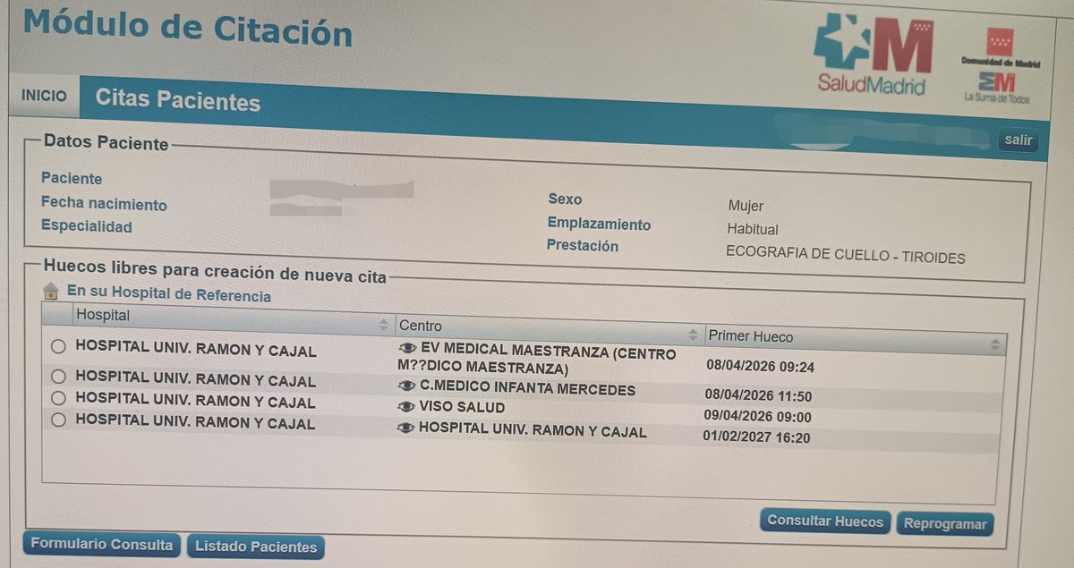 Cardiologia creo que 4 meses, medicina interna en la paz solo 2 meses es algo que solo lo hay en Madrid y Barcelona (enfermedades poco comunes) y por desgracia onco-Trauma en 15 dias tenia cita ….pero la cosa era muy grave y dificil, pero vaya equipo de 1ª division que tenian en el Gregorio, nunca estaremos lo suficientemente agradecidos los familiares de dar calidad de vida a un enfermo que no le quedaba mucho de vida y encina no era de Madrid sino de un pueblo de Avila (donde no nos dieron opcion alguna). Ahi es donde se ve la calidad de los equipos medicos /hospitales y servicios. Hasta que no te toca en serio no lo ves.
