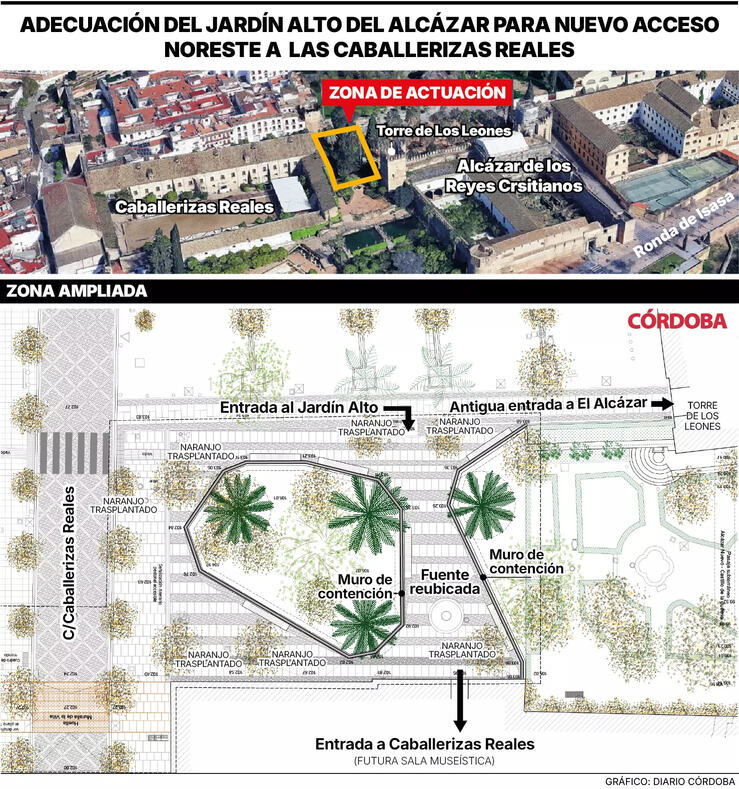 Se ha licitado la obra para reformar el Jardín Alto del Alcázar de los Reyes Cristianos con el objetivo de abrir un nuevo acceso a las Caballerizas Reales (recuperando una antigua puerta existente). La obra va a suponer que gran parte de este jardín se integre en la vía pública.