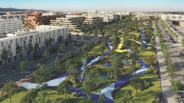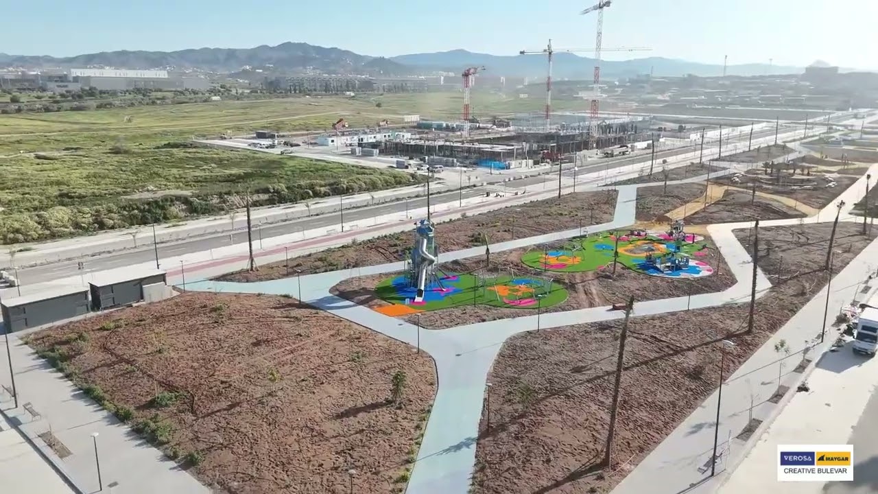 Parcela en la que se realizará el centro comercial, junto a un parque también en obras. Sur