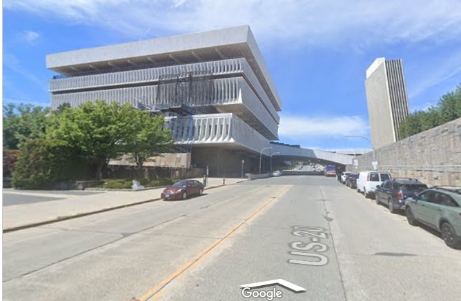 Parece un retazo de Brasilia incrustado en medio de Albany, cosiendo, a modo de grapa, el tejido urbano roto por la autopista… (¿inspiración para alguna M madrileña?)