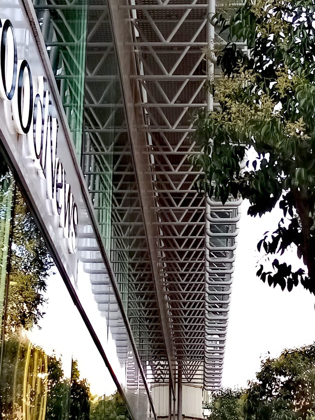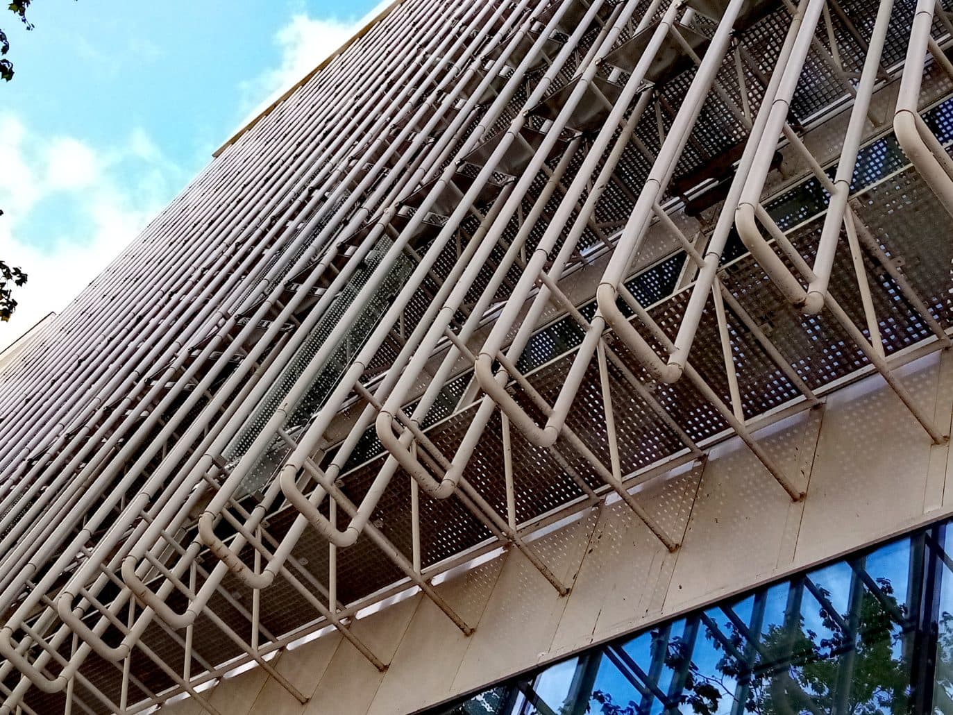 Es la típica envolvente de los 70, cuando se usaba la sofisticación industrial en un edificio como imagen corporativa.