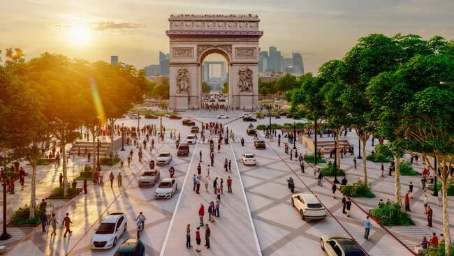 Yo esto de París tampoco lo veo mucho mejor la verdad, salvo por la ausencia de árboles. Es una acera “a secas”, no muy ancha y con tráfico a ambos lados. En base al render no da mucha sensación de seguridad para pasear por ella (se supone que para eso están los bulevares). Sólo le veo sentido para que los turistas puedan hacer fotos con el arco mejor centrado.