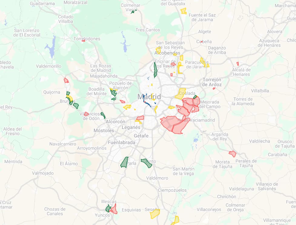 Desarrollos urbanísticos alrededor de Madrid. En distintas fases (proyectados, aprobados, en construcción). Para unas 200.000 viviendas.