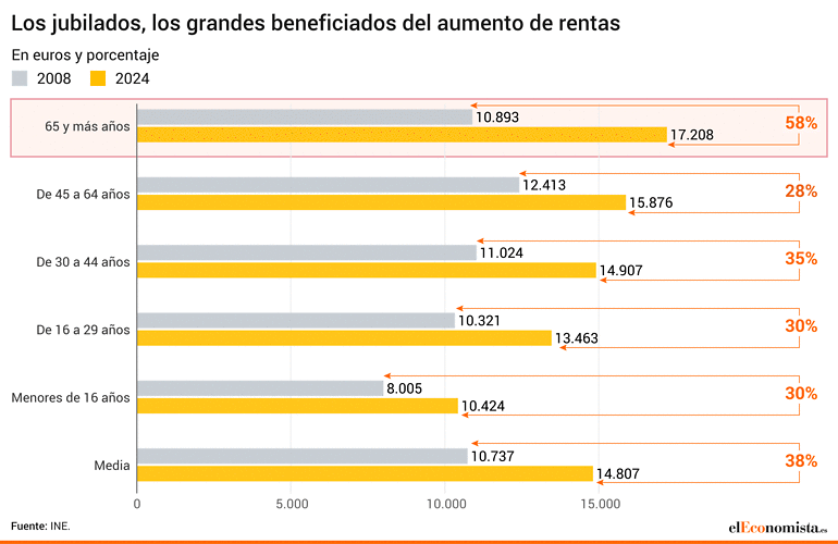 COn una inflación entre diciembre de 2008 y diciembre de 2024 del 35% (Fuente INE), vemos que los españoles tienen ya una renta mayor que la que había en 2008, pero mientras que los mayores de 65 han ganado más de 20 puntos de poder adquisitivo por el efecto cruzado de la subida de las pensiones y las rentas financieras de sus ahorros. El tramo entre 30 y 45 años, mantiene el poder adquisitivo, pero los menores de 30 y la población entre 45 y 64 años han perdido poder adquisitivo, especialmente entre el tramo de mayores de 45, por la expulsión del mercado de trabajo de los mayores de 45 años.