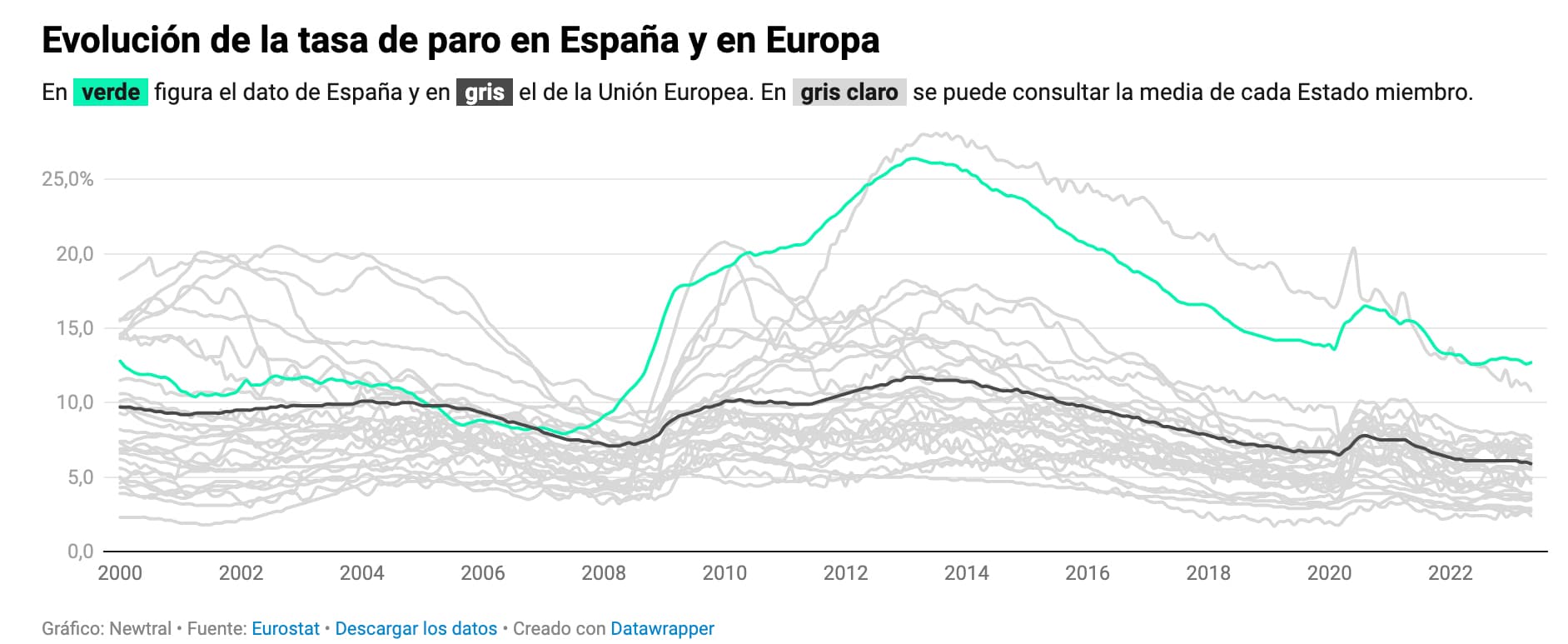 Problema que no acaba de solucionarse. Desde la crisis del 2008 España junto con Grecia han tenido una tasa de paro claramente superior que el resto de Europa