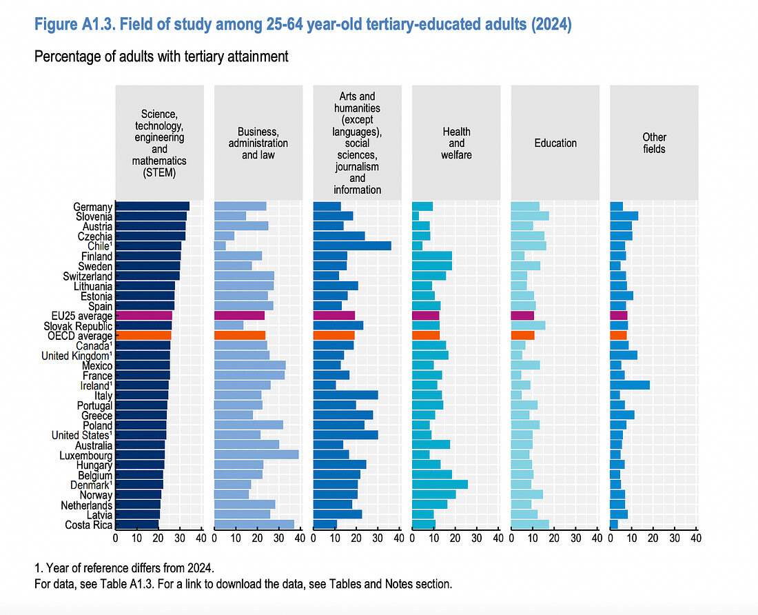 Me han sorprendido estos datos . el porcentaje de personas con educación superior en areas de ciencias, ingeniería y matemáticas supera la media decla OCDE y de la UE