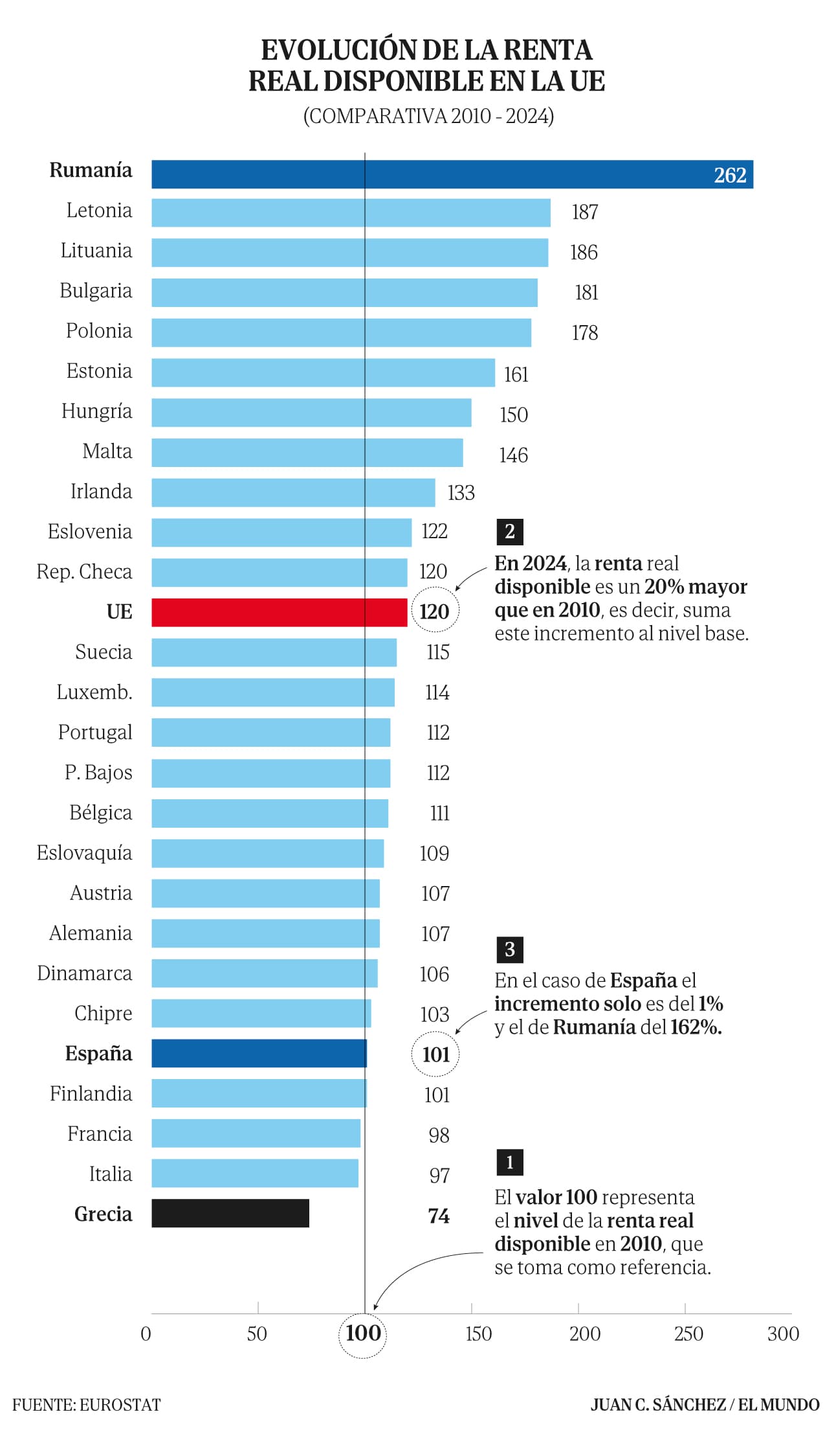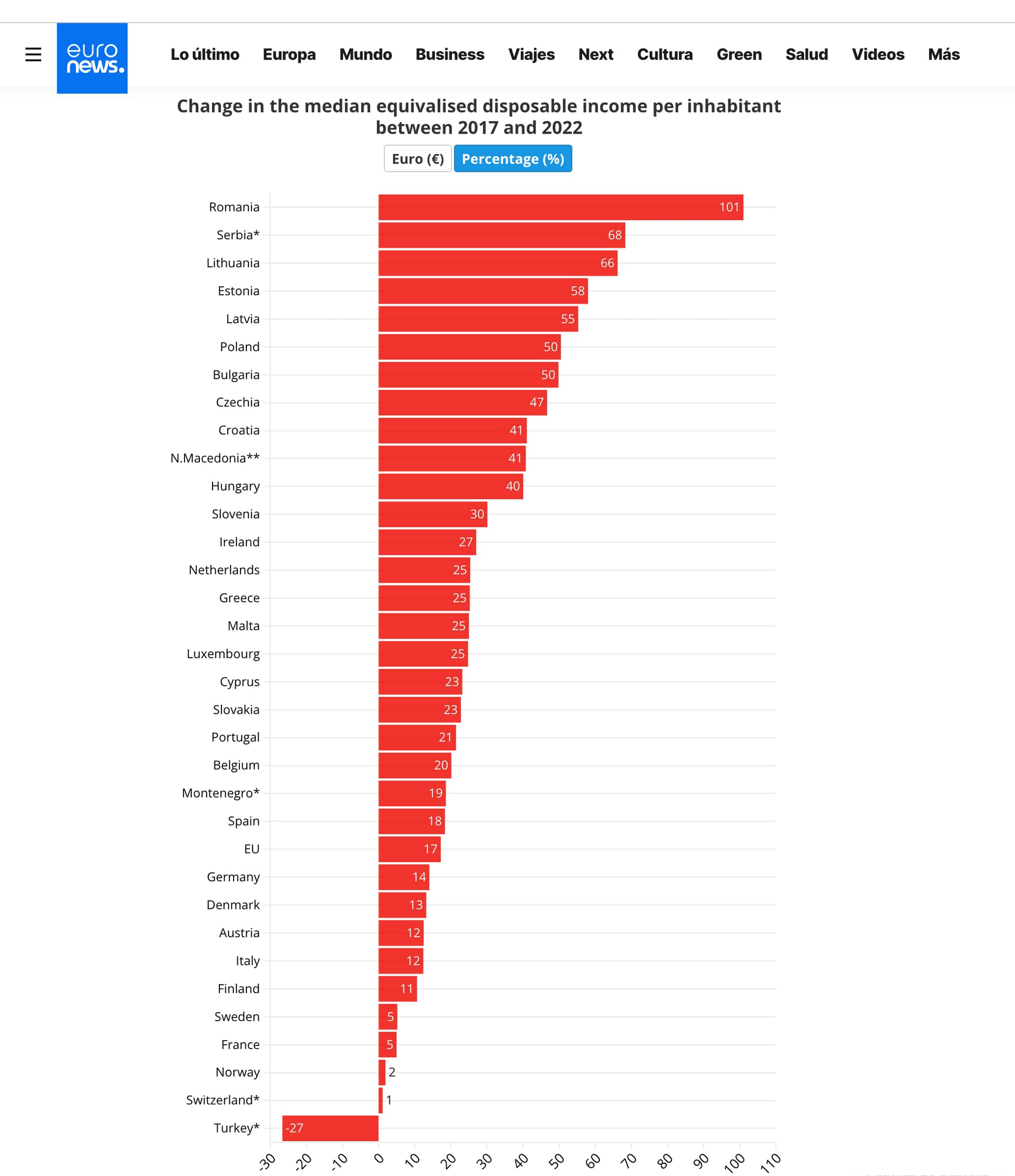 Los países que más incremento tienen porcentualmente son los del antiguo bloque soviético. “La variación porcentual en los países en los que la renta media disponible fue superior a la media de la UE experimentó muy pocos movimientos, como el 1% en Suiza, el 2% en Noruega y el 5% tanto en Francia como en Suecia.”