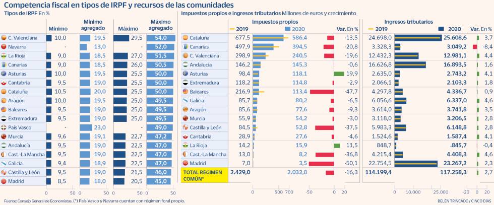 - Madrid tiene los tipos más bajos en el impuesto de la renta y Cataluña y la Comunidad Valenciana los más elevados