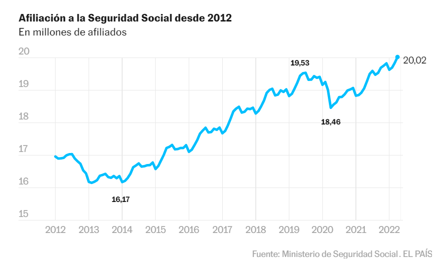 El aliño perfecto para redondear el plato estadístico de abril proviene del número de afiliados a la Seguridad Social, que por primera vez ha superado la barrera de los 20 millones (20.098.119, concretamente) a final de mes, algo que no se había producido en los 22 años que contabiliza la serie histórica. Gracias a este espectacular incremento (+184.577), el nivel de empleo supera en 768.851 trabajadores al que existía en febrero de 2020, el último mes sin el influjo de la pandemia.