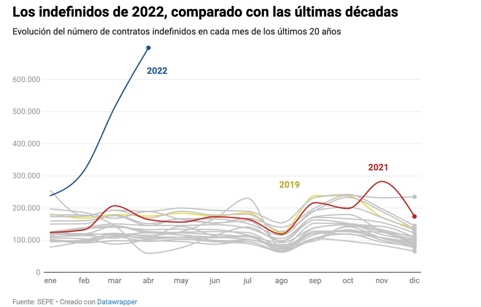 Lo que no es posible es hacer un contrato de obra y servicio… así que las empresas hacen fijo-discontinuo… que entra como “contrato fijo” pero que te llaman cuando quieren. La realidad no ha cambiado mucho más allá de que queda bien en la gráfica.