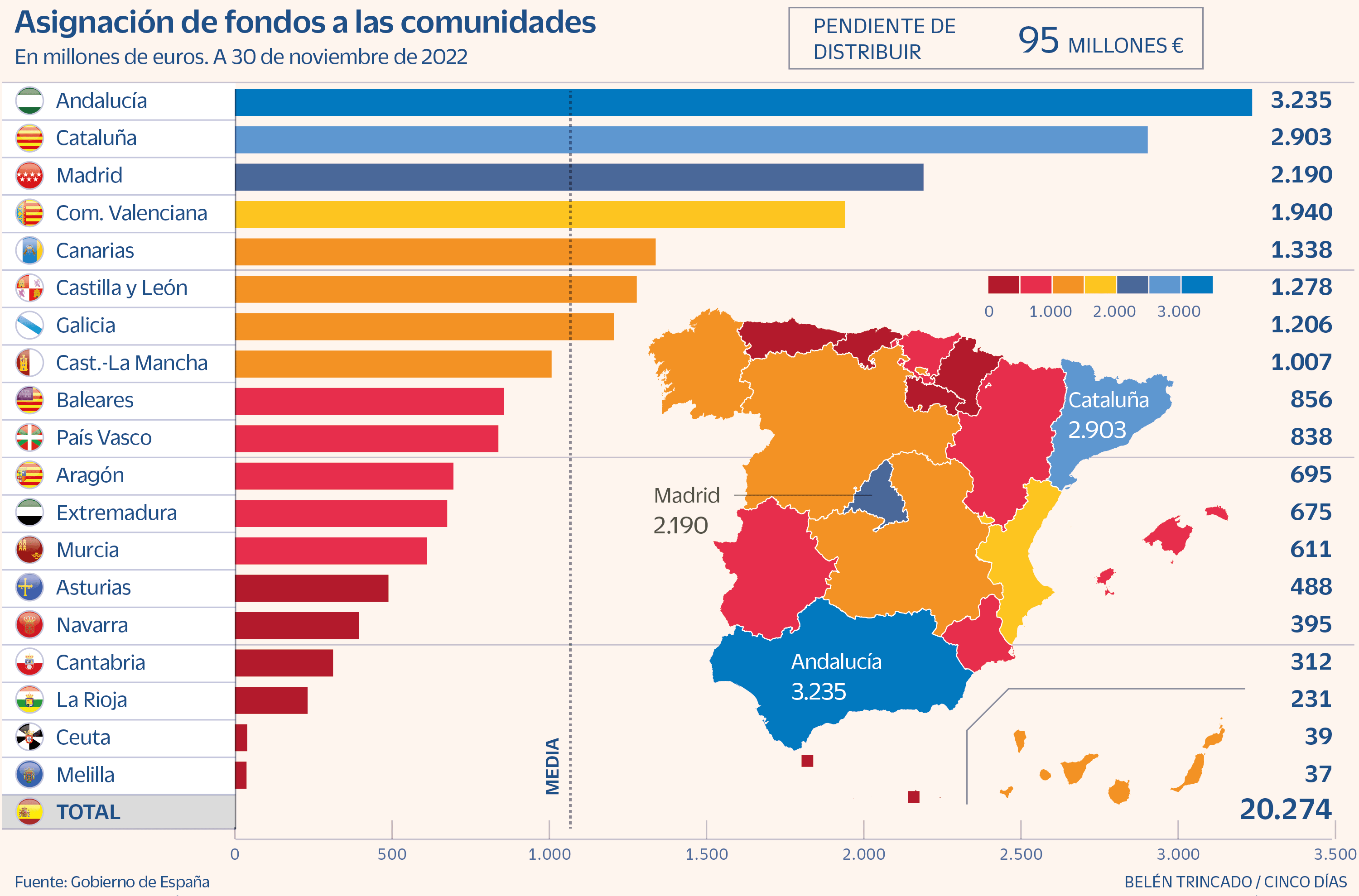el verdadero problema está siendo la ejecución real de las subvenciones. A finales de noviembre y según datos de CEOE, ese porcentaje apenas alcanzaba el 11,5% del total de ayudas. En concreto, 8.000 de los 69.500 millones prespuestados para España dentro del instrumento Next Generation. La mejoría en el ritmo de entrega de fondos a las autonomías es relevante, en tanto incrementa la presión sobre los gobiernos regionales para acelerar las licitaciones y su resolución, la única vía para que el dinero se filtre a la economía real.