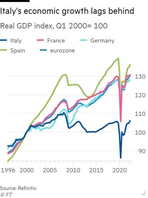 Muchas veces los árboles no nos dejan ver el bosque. En un artículo sobre Italia veo esta gráfica de FT donde vemos el crecimiento de las 4 mayores economías de la zona Euro. Saco dos conclusiones: