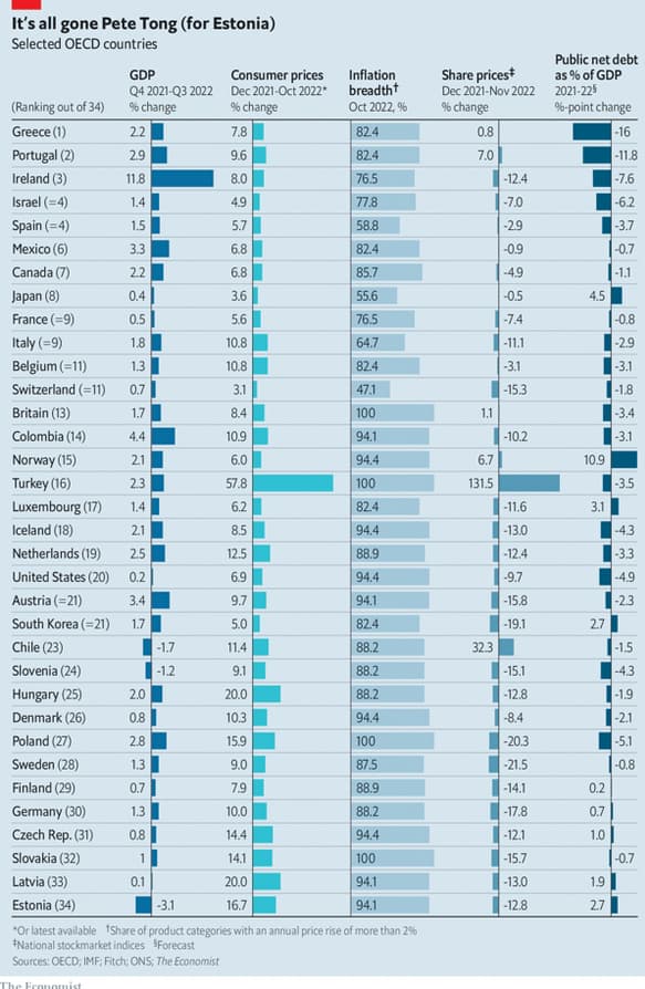 The Economist ha recopilado datos sobre cinco indicadores económicos y financieros (PIB, inflación, amplitud de la inflación, desempeño del mercado de valores y deuda pública) para 34 países, en su mayoría ricos.