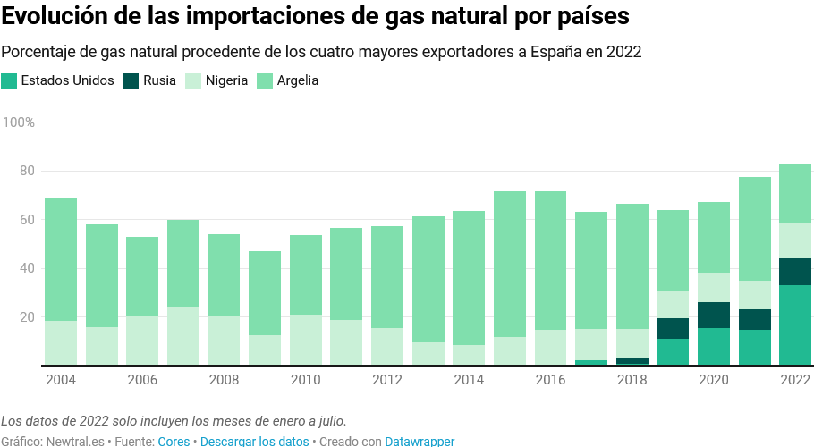 Hemos bajado drásticamente la dependencia de Argelia de más del 50% a una cuarta parte, proceso que se ha acelerado en los últimos meses, pero que viene de largo plazo. Las compañias privadas españolas llevan varios años renegociando el contrato de gas con Argelia, pero no llegaban a un acuerdo por que Argelia queria compromisos de compara mayores y las compañias españolas no querian volver a cometer el error de calculo que llevo a las renegociacion de 2020 entre España y Argelia, del que Argelia salio escaldada y nos la ha devuelto cuando las posiciones se han tornado en favor de los productores, pero que España ha eludido mediante la diversificación. Ese es el origen del contrato de Rusia en 2018, cuando Rusia parecia fiable.
