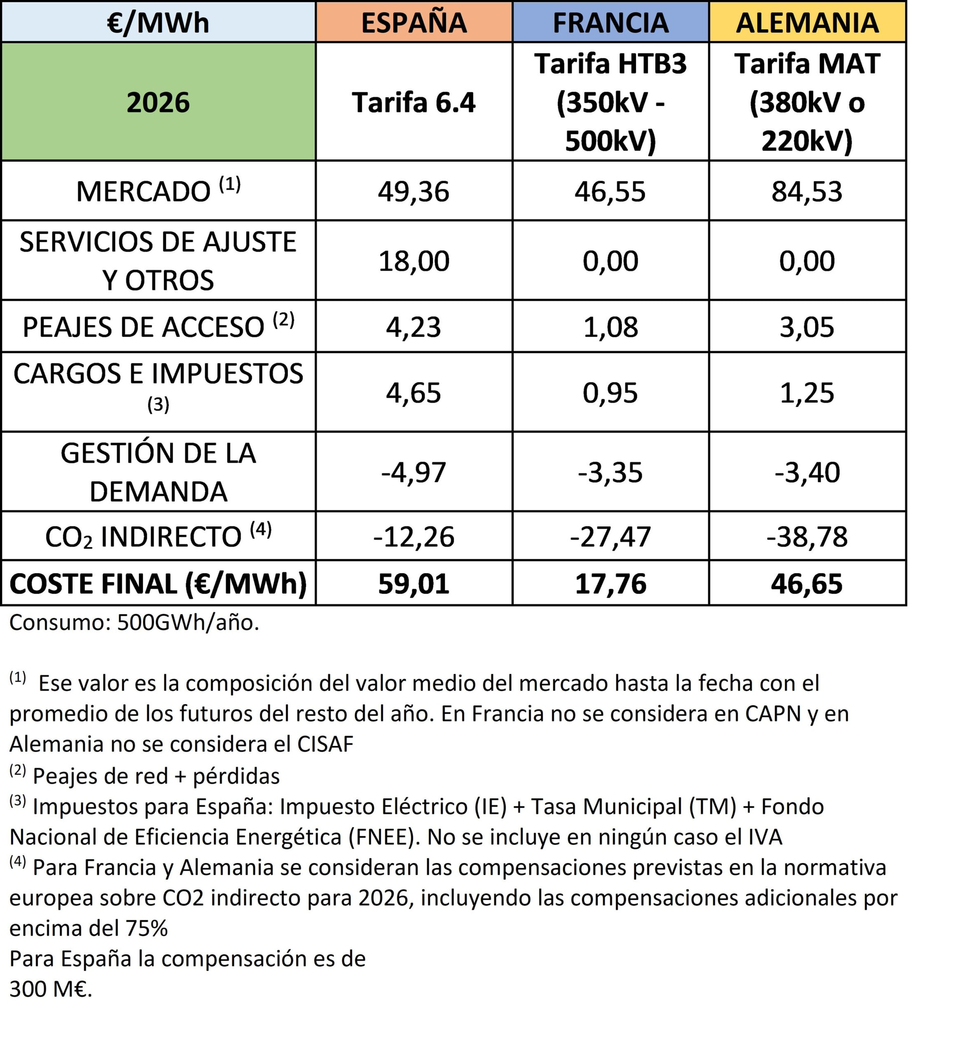 Comparativa de precios eléctricos finales en la industria electrointensiva en 2026.