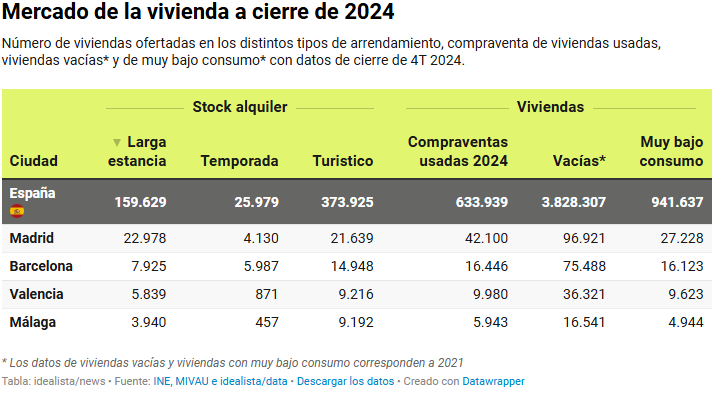 Yo sigo sin entender por qué se habla de la vivienda turística con respecto al parque inmobiliario y no al mercado inmobiliario. El parque inmobiliario entero no está en alquiler/venta. Me parece más relevante cuántas viviendas del mercado del alquiler son turísticas. Aquí vemos que las viviendas ofertadas de uso turístico son más del doble que del residencial (larga estancia y temporal):