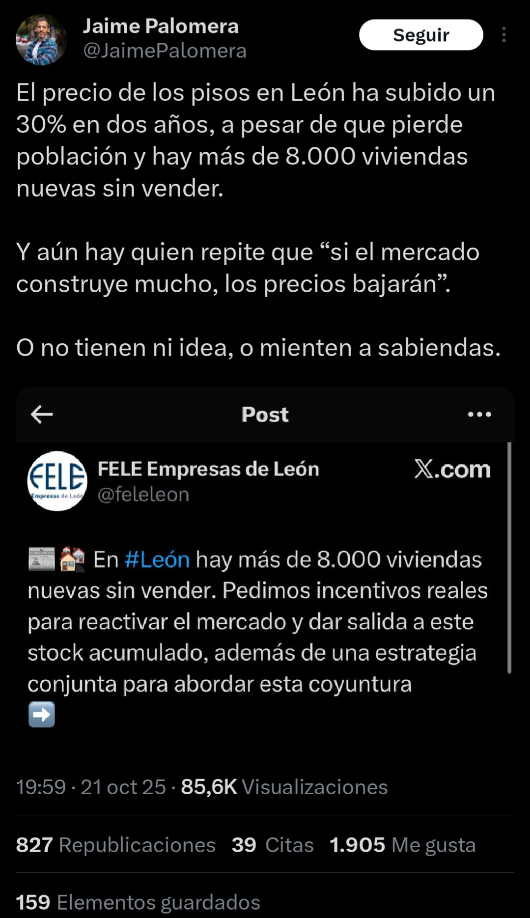 Este es el tipico ejemplo de mentalidad colectiva, si en Madrid y Barcelona los pisos suben y son una “gran inversion” porque gano pasta con ello, en toda españa ( y en Leon) la gente se compra pisos como modo de inversion facil y rentable. Al final lo que pasa en las capitales se contagia en el restos tengan o no motivos para hacerlo.