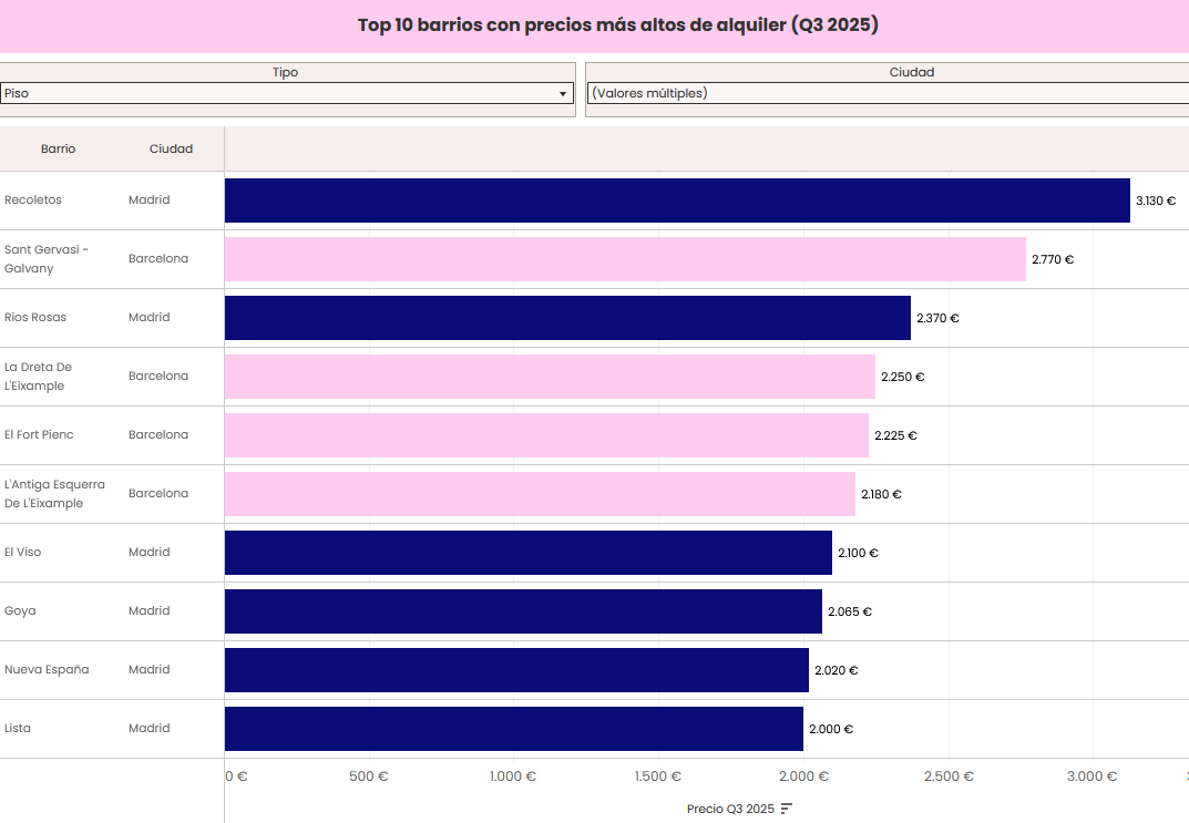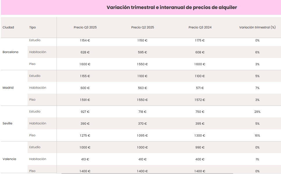Precio medio de alquiler de temporada (estudio, habitación y piso) de las 4 mayores ciudades de España Q3 2025, Q2 2025, Q3 2024 (en el informe hay más ciudades españolas y europeas).