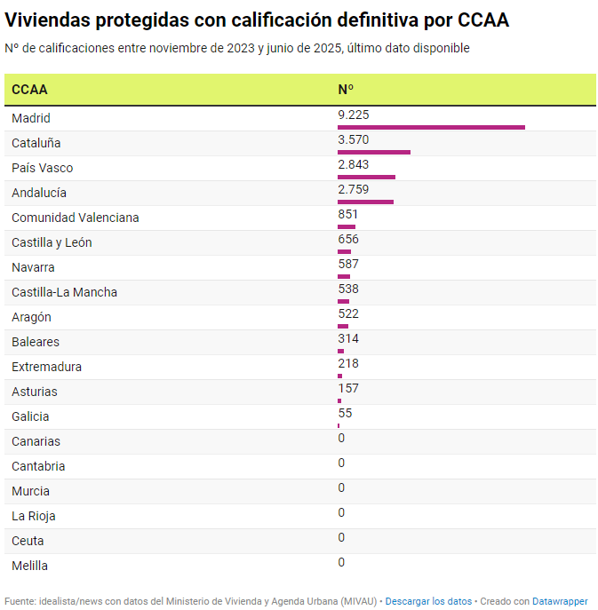 Si miramos los datos por CCAA, descubrimos que Madrid, la región que más se está enfrentando a la política de vivienda del Ejecutivo Central, es la que está tirando del mercado nacional. Desde que Isabel Rodríguez tomó las riendas de la Cartera de Vivienda, la región madrileña atesora 9.225 viviendas protegidas con calificación definitiva, lo que representa el 41,3% del total nacional, más que la suma de las tres siguientes autonomías de la lista: Cataluña (3.570 unidades, el 16% del total), País Vasco (2.843, con el 12,7%) y Andalucía (2.759, con otro 12,3%).