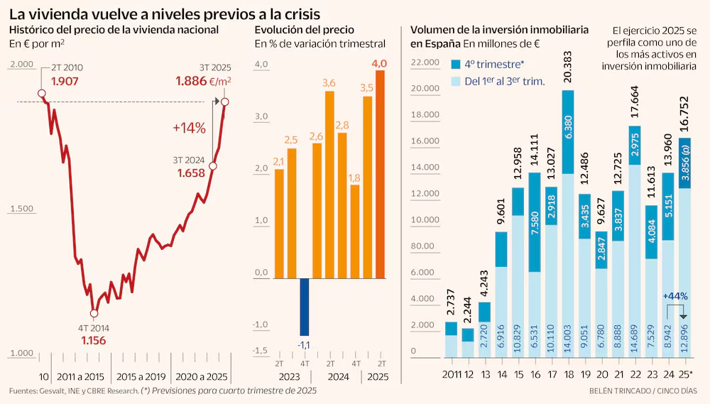 El mercado arrastra un déficit de más de 700.000 casas en una década y una subida de precios del 13 % solo en el último año, aunque la inversión bate récords en España