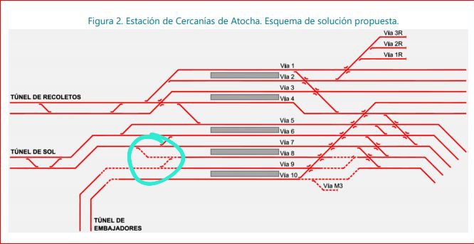 Esta es la zona en cuestión que comentábamos más arriba, donde hay que “sacar” la vía 8 de su camino hacia el túnel de embajadores para dirigirla al túnel de Sol.