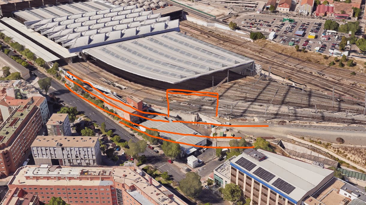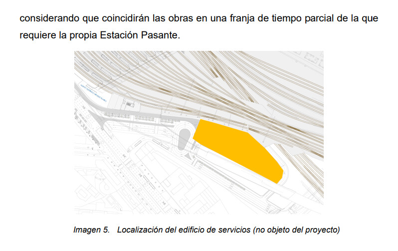 En cuanto a la parcela que señalas en naranja, se habla de un edificio de servicio (ya independiente del proyecto de la estación pasante) pero no concretan nada de nada sobre él. Sí concretan más sobre el viario de esta zona, donde habría una gran bolsa de taxis.