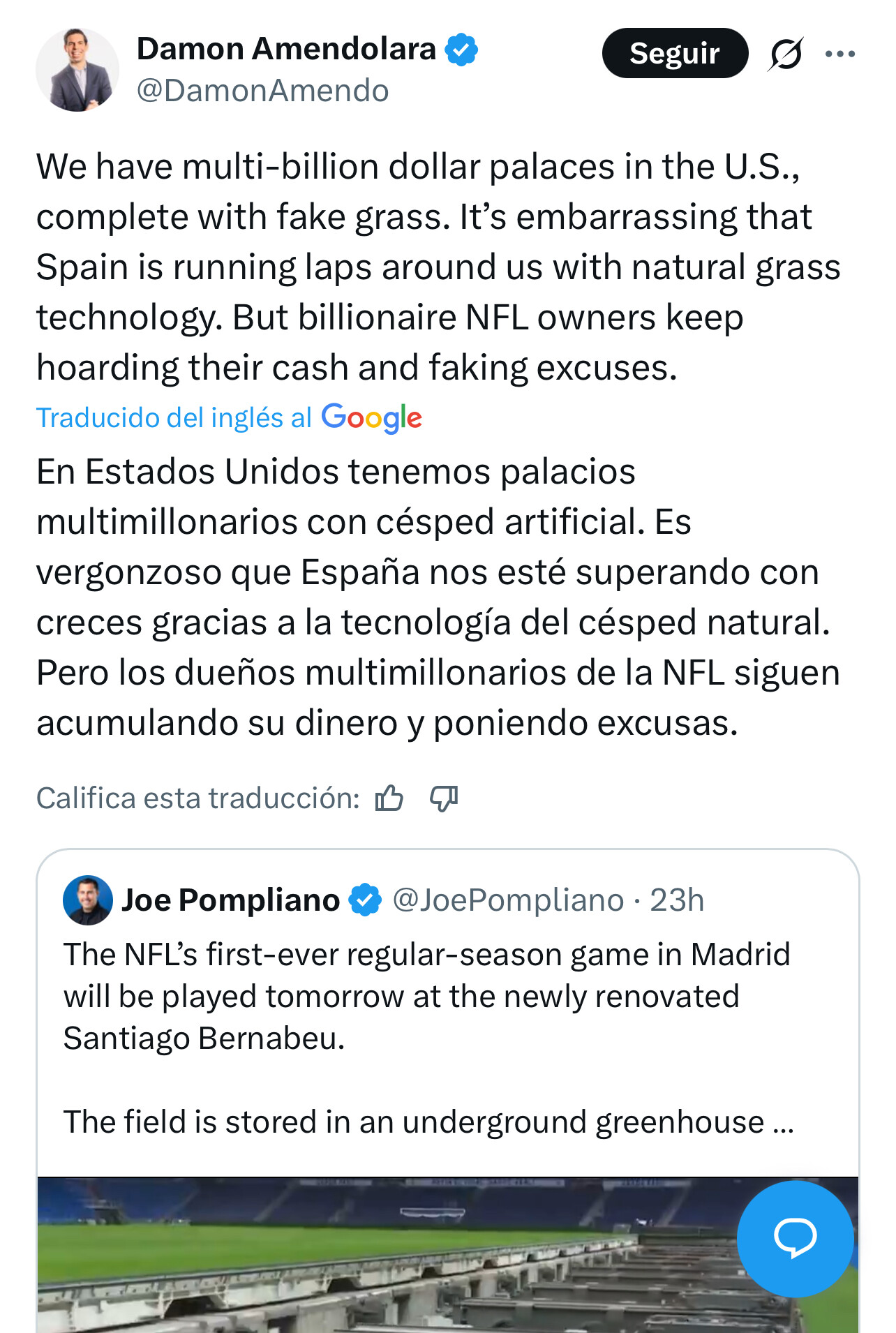 Lo realmente importante es que el presidente de la NFL y cuatro acolitos digan, sin mayor argumentación, que el Bernabeu es el mejor estadio del mundo.