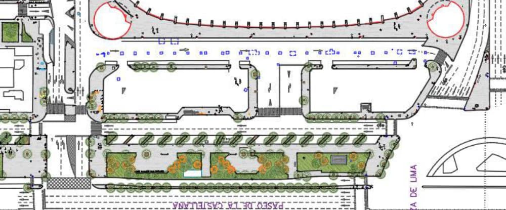 Además de la explanada oeste junto a la Castellana también se peatonaliza la calle Rafael Salgado y se crea otro espacio peatonal debajo de la nueva fachada que da a la Plaza Sagrados Corazones.
