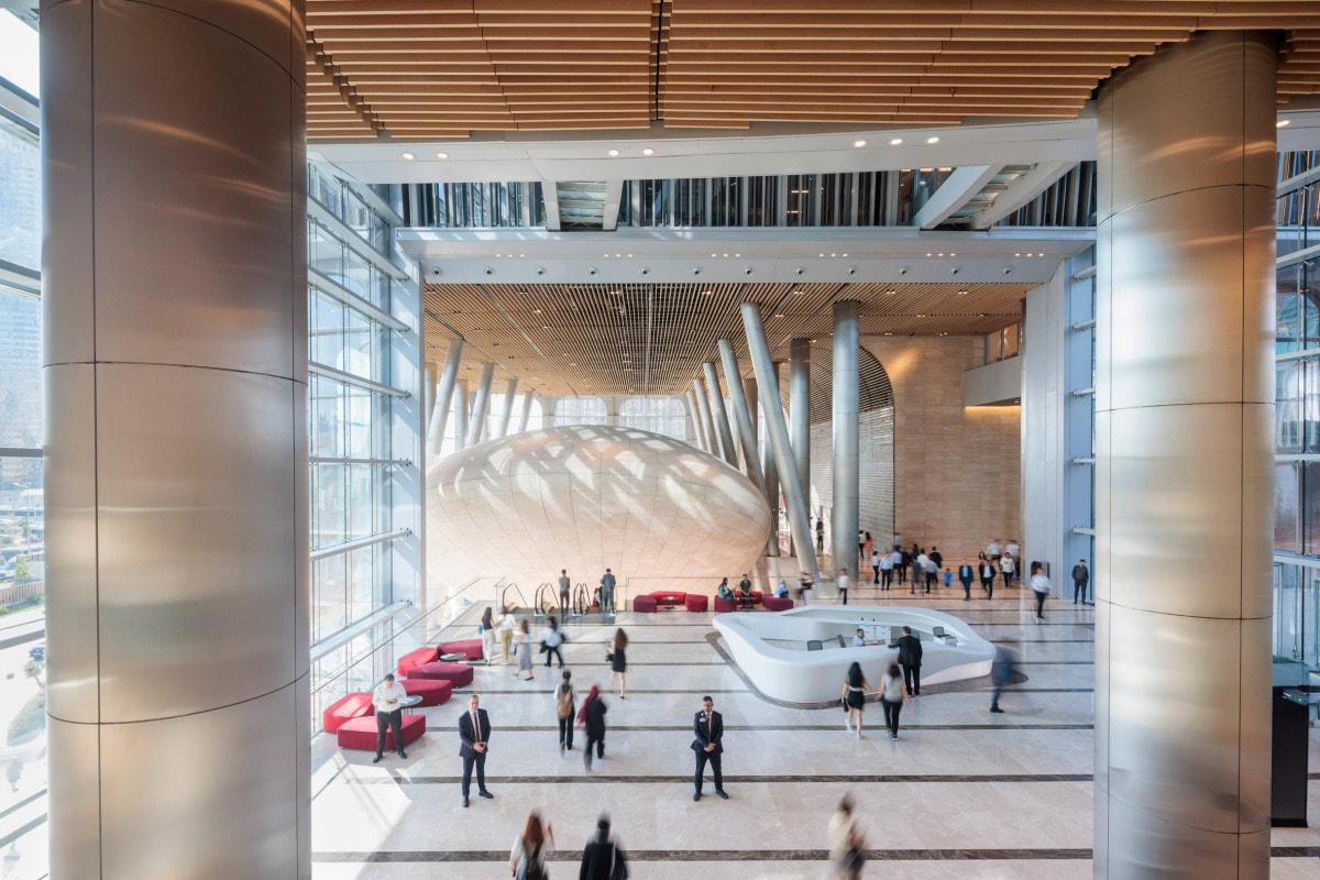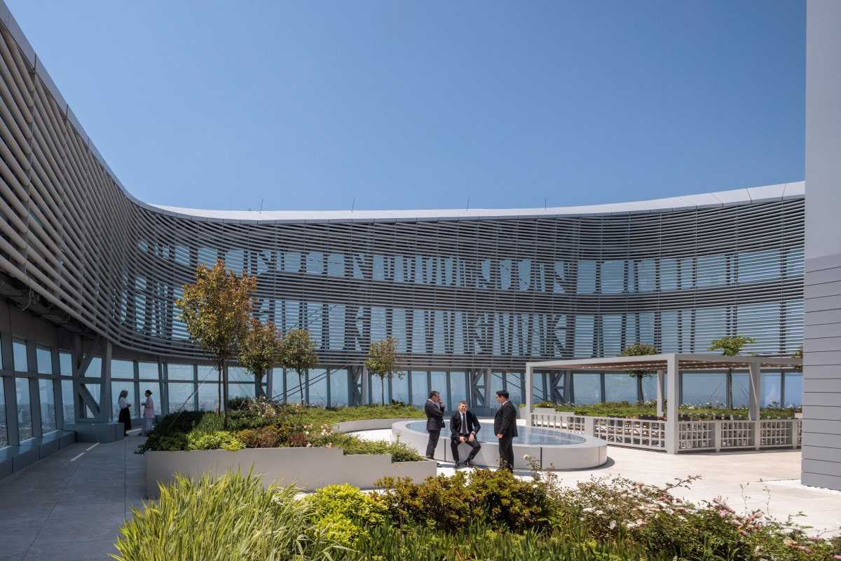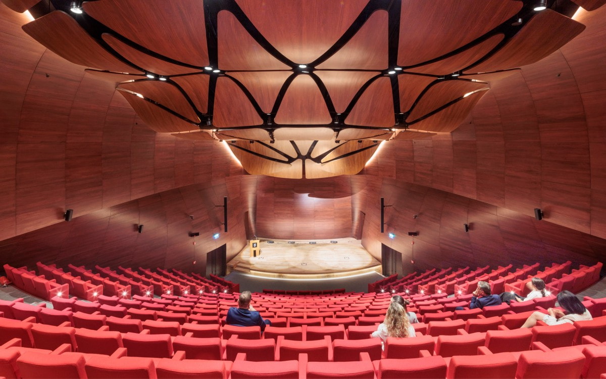 En contraste con esta envolvente contemporánea, el podio introduce una capa más vinculada a la tradición local. Así, sus fachadas están envueltas por pantallas ornamentadas inspiradas en la arquitectura islámica, reinterpretadas mediante sistemas de sombreado en capas.